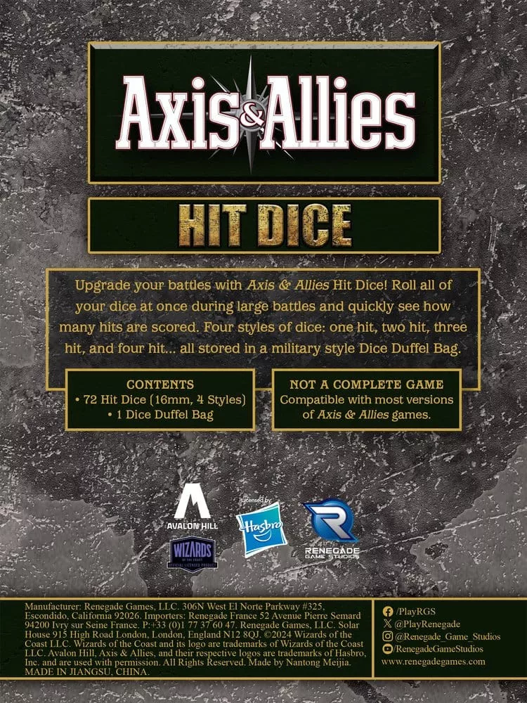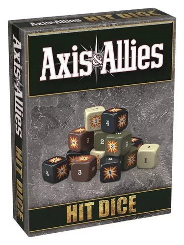Upgrade your battles with Axis & Allies Hit Dice! Roll all dice for large battles at one time and quickly see how many hits are scored. There are a total of 72 dice in four styles: one hit, two hit, three hit, and four hit... all stored in a military style Dice Duffel Bag.