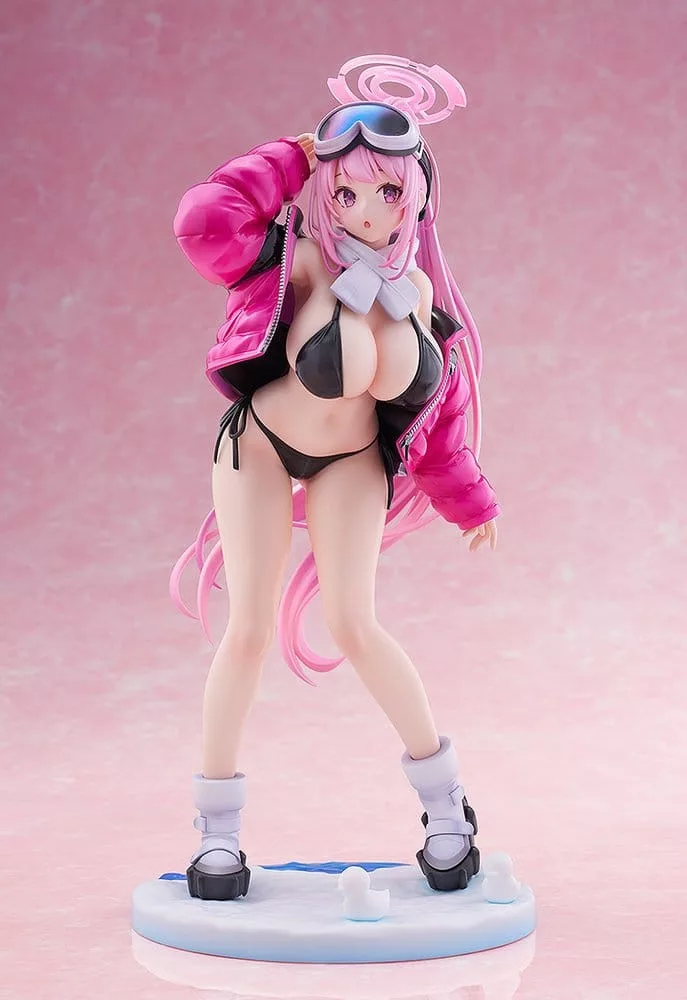 From the popular game 'Blue Archive' comes a 1/7 scale figure of Eimi, a member of the Super Phenomenon Task Force at Millennium Science School, in an eye-catching swimsuit! In her pursuit of efficiency (?), Eimi has embraced a bold outfit that perfectly embodies her signature style, paired with an effortlessly cool demeanor that is uniquely her own. A loose-fitting, billowing pink down jacket is casually draped over her shoulders. The contrast with her black bikini highlights Eimi's allure even further. No compromises were made in the sculpting, either. Details such as the soft-looking skin, the lustrous and wrinkled look of the jacket, and the scarf and goggles atop of Eimi's head have all been realized with great care. An interchangeable smiling face part is also included. Her gentle smile is a must-see for all fans! Add Eimi to your collection and experience her special Sensei-wowing winter moment for yourself!