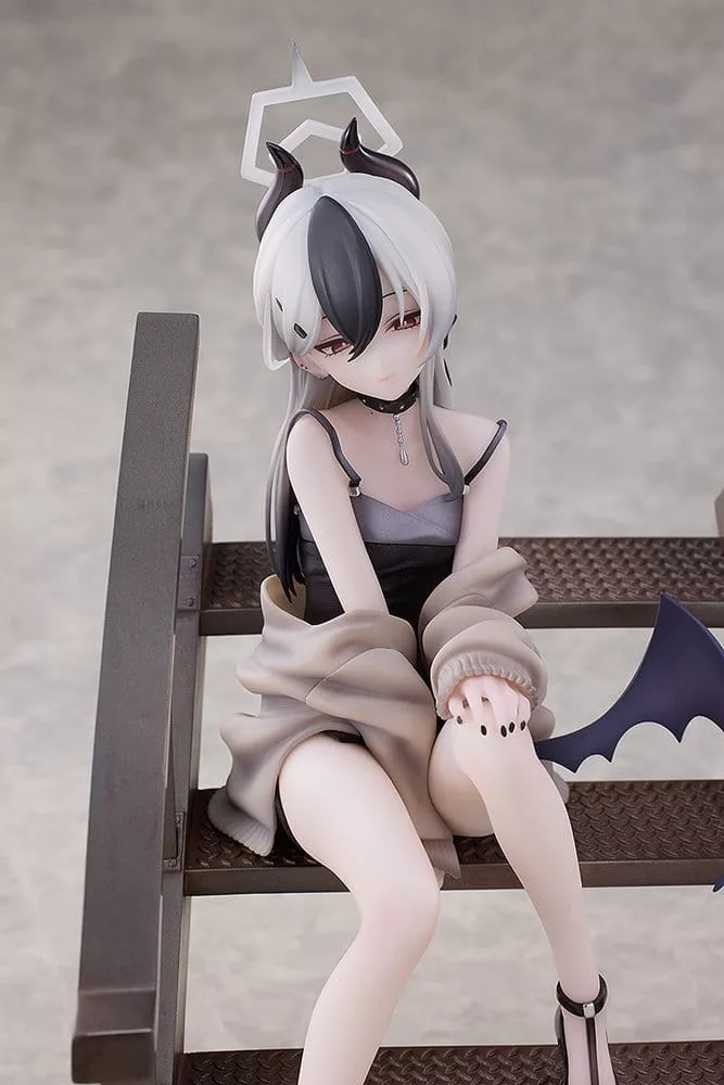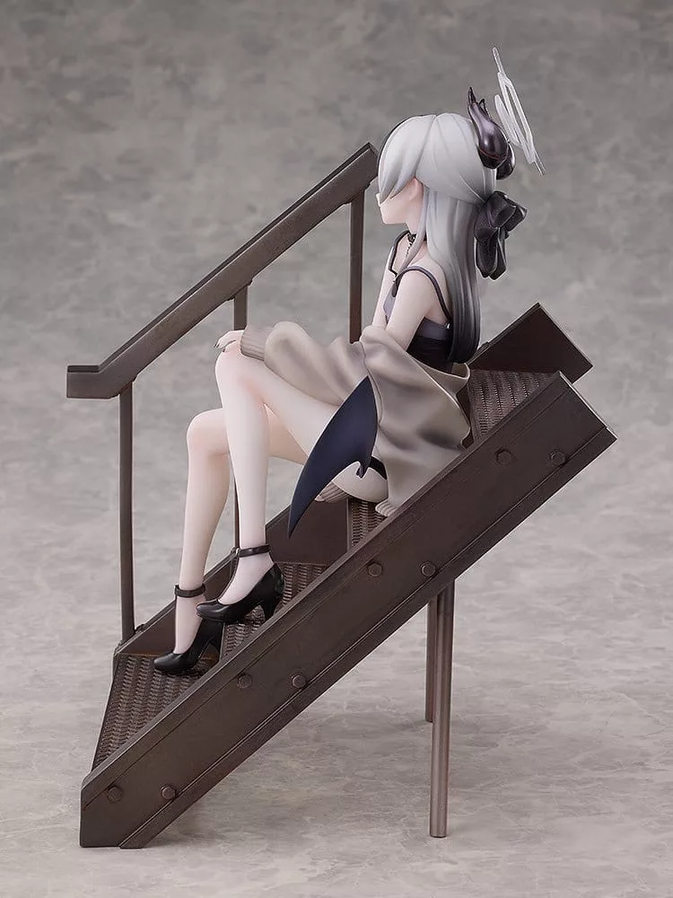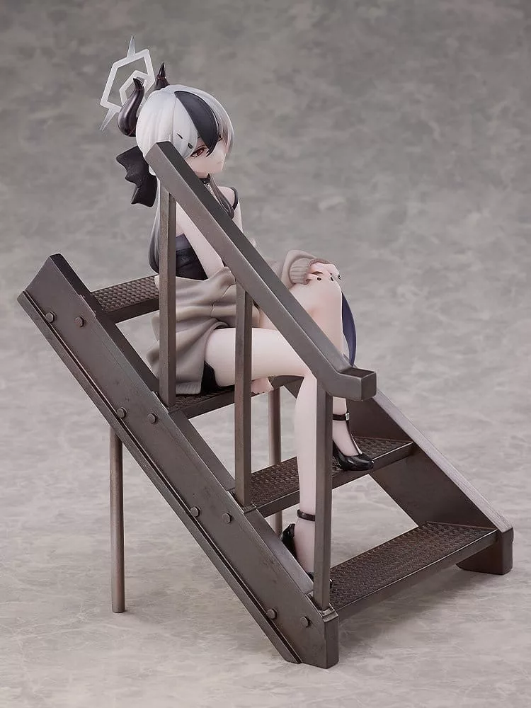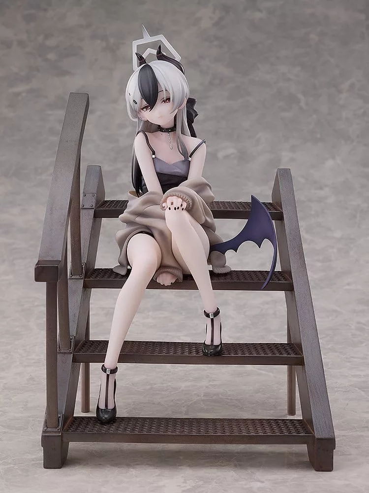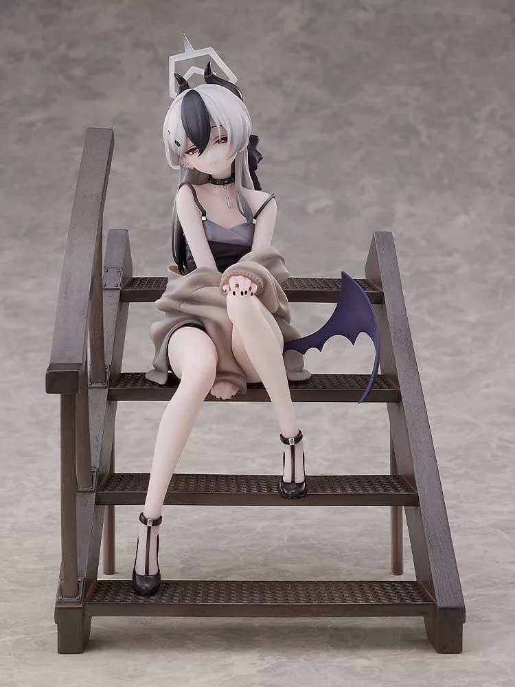 From the popular game 'Blue Archive' comes a 1/7 scale figure of Kayoko, a member of Handy Solver 68! The figure features Kayoko with her long monochromatic hair tied up with a black ribbon, and a black-and-gray camisole dress that shows off her delicate physique. Kayoko's simple yet sophisticated attire accentuates her calm and composed personality. The special staircase base evokes a moment spent with Sensei in the memorial lobby, with the sunset behind. Sitting atop the stairs with her hands on her knees, the figure is based on Kayoko in a relaxed pose. Details such as her half-worn cardigan and soft purple wing are also included. Her gentle expression is captivates whoever lays their eyes on her, with a hint of playfulness. The mole on her collarbone, her earrings, choker and her black nails have all been carefully brought to life in figure form. Her mature charm is apparent in every detail. A smiling face part is also included for a different display option. Enjoy seeing different sides of Kayoko with the use of the interchangeable face part. Be sure to add this figure of Kayoko to your collection.