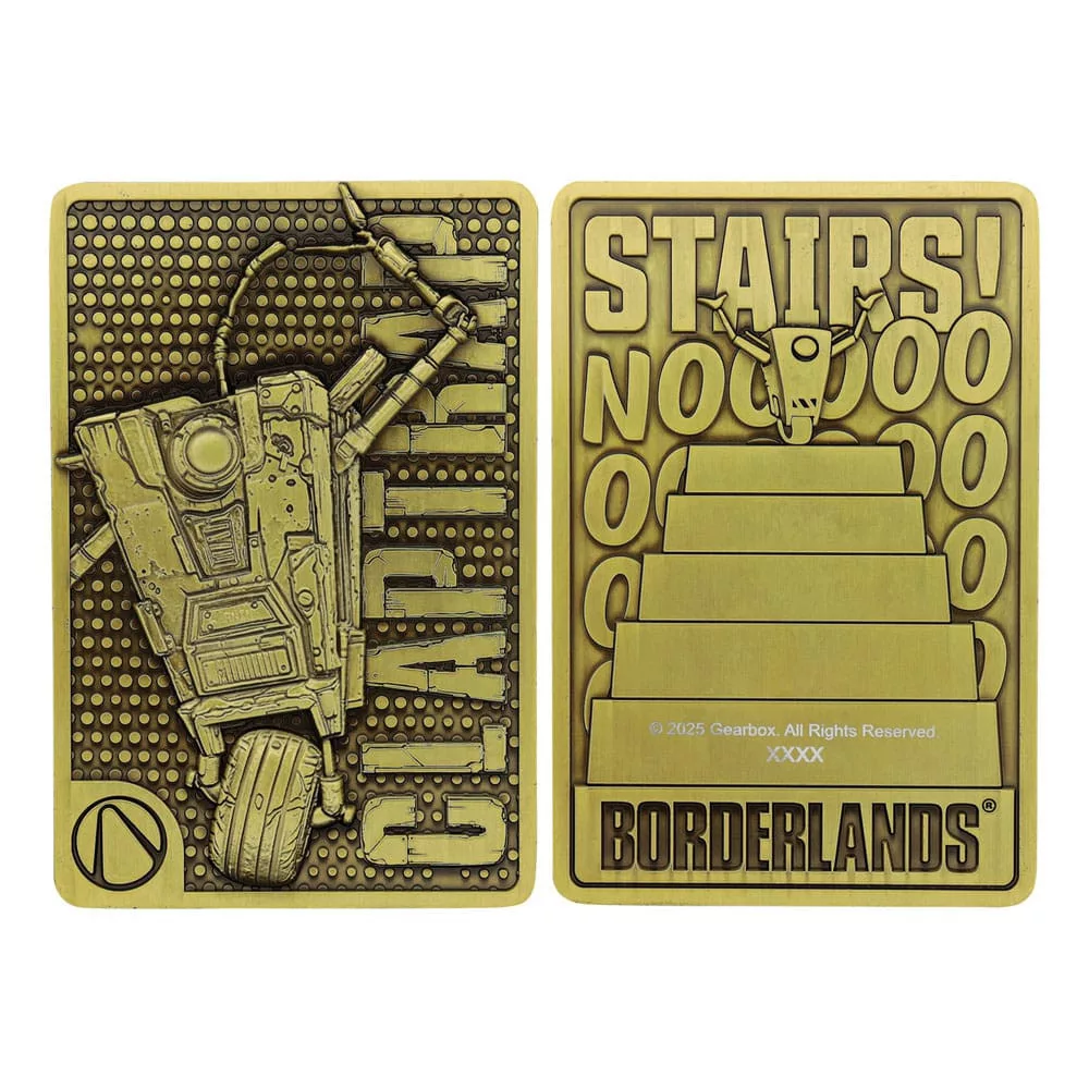 'Appearing in many different Borderlands games, Claptrap is the fan-favourite general purpose robot produced by manufacturer Hyperion. This limited edition ingot depicts the CL4P-TP robot to the front, and one of his mortal enemies, stairs, to the reverse, along with its induvial number as one of 5,000 worldwide.