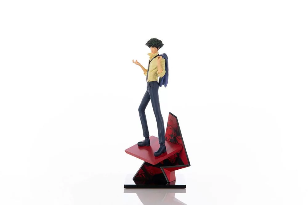 This high-quality 1/8 scale resin statue showcases Spike Spiegel in a relaxed pose, holding a cigarette in his right hand while casually slinging his suit jacket over his left shoulder. The statue faithfully captures Spike's distinctive appearance, including his messy hair, blue leisure suit with a yellow shirt, and tall, lean frame. The base boasts a meticulously crafted abstract design that perfectly reflects the