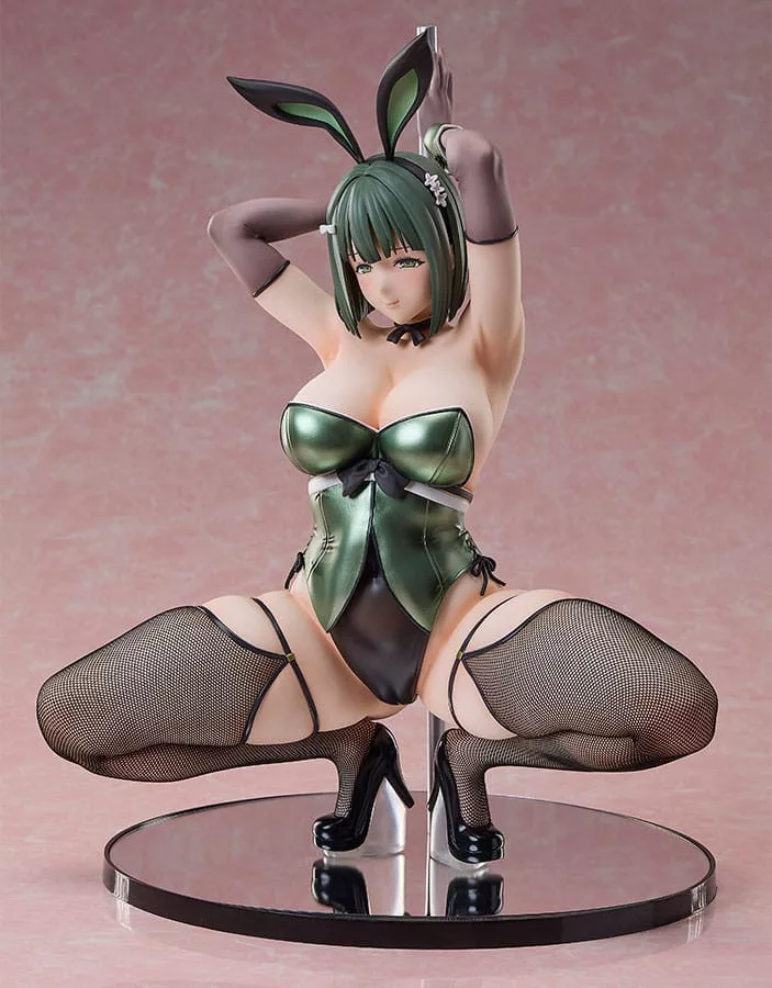 Her voluptuous body is wrapped in a refined and elegant green bunny suit,