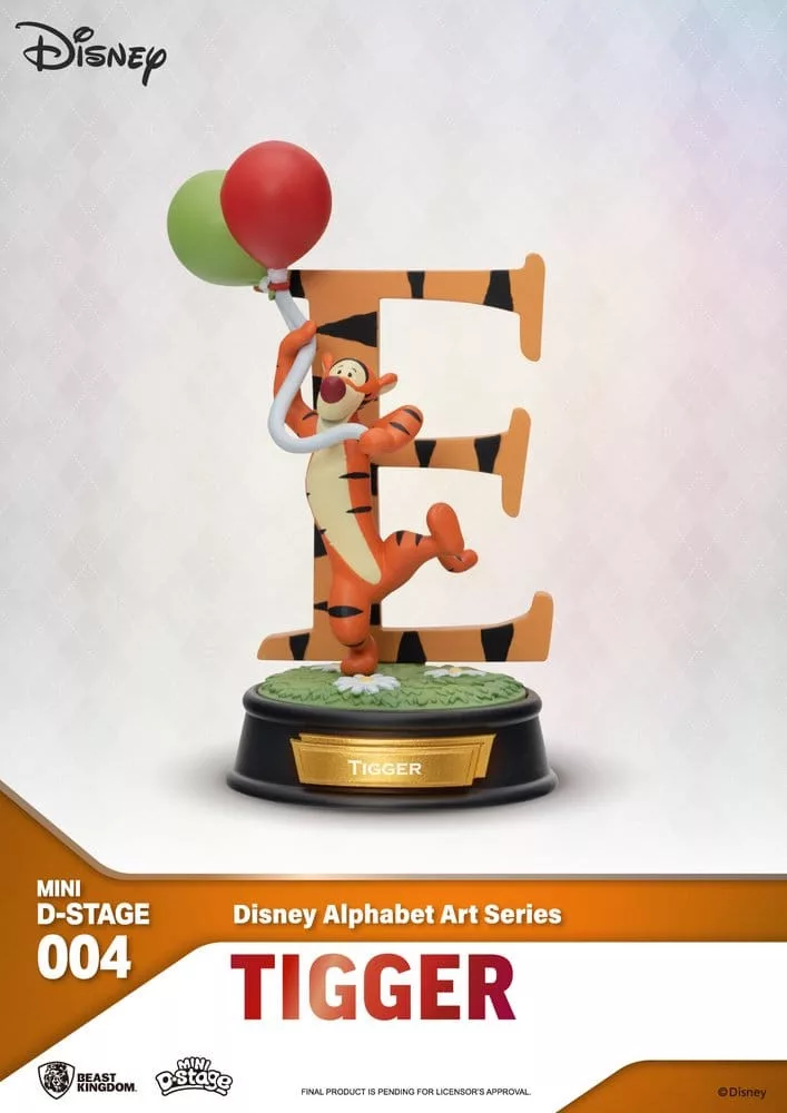 Each letter in 'DISNEY' represents a famous character that embodies that particular letter. The series features six classic characters: 'D' showcases the energetic Donald Duck in his classic sailor outfit, 'I' brings the adorable mascot Mickey Mouse with his iconic white gloves, 'S' features the extraterrestrial experiment 626, Stitch, engrossed in his favorite book, 'N' stars everyone's favorite chipmunk duo, Chip n Dale, 'E' showcases Tigger famously flying away with balloons, and finally, 'Y' presents the lovable Winnie the Pooh enjoying some delicious honey.