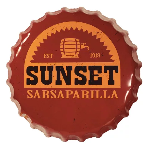 'Featuring the iconic Sunset Sarsaparilla logo in the shape of a giant bottle cap making a unique addition for fans of vintage vibes and post-apocalyptic style.
