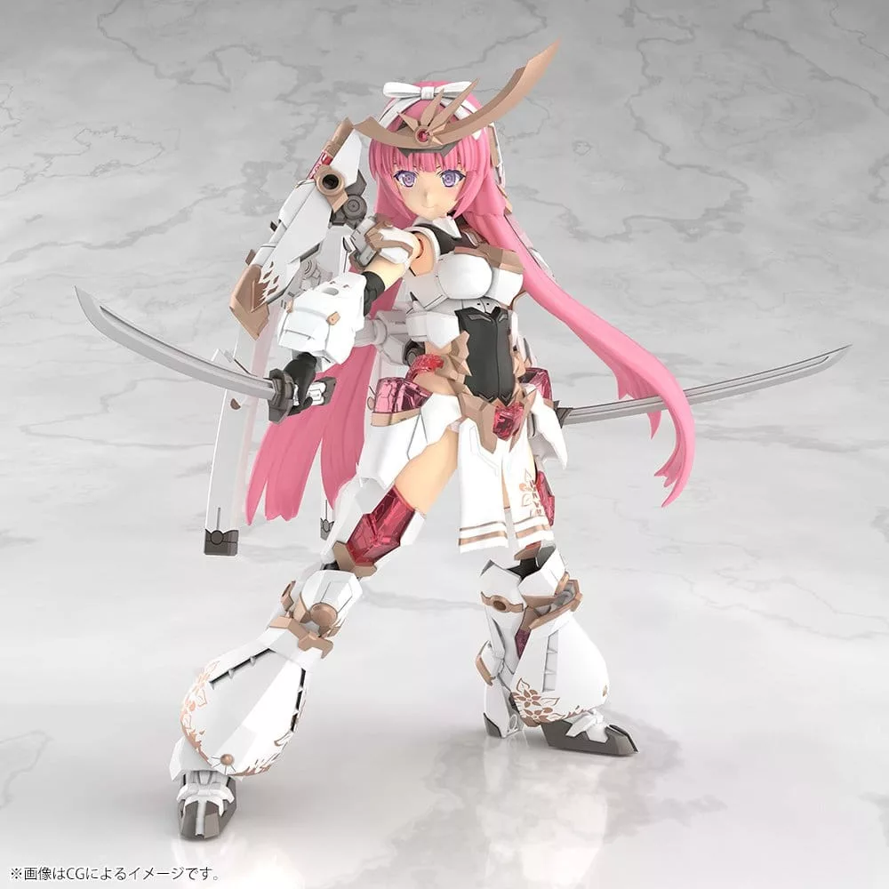 Introducing the latest addition to the brand-new GRANDE SCALE series, MAGATSUKI KIKKA! Magatsuki is now available at 1/6 scale (approx. 25cm)! This version too was designed by ToMo and E-ji Komatsu. The original, detailed Kotobukiya CAD data has been enlarged to a new GRANDE SCALE. From the ease of assembly and painting to the range of play and poseability, this kit incorporates all the great features of a larger model. Model Specifications: - Includes the gold decals featured in the KIKKA design. - Thanks to the increased size, the color scheme has been more accurately recreated. - Includes three types of faces printed with tampography (Smiling, Injured, and Eyes Closed). - This model's distinctive, transparent armor has been recreated with clear parts and has engravings carved underneath them. - The 5mm joints enable this model to be assembled into the default form as well as a special “Kunoichi Mode.” - Includes two sets of special weapons, Tenkai (long swords) and Satsuga (short swords). - The weapons can be sheathed and unsheathed without changing out parts. - Joint parts are included to attach the long sword Tenkai to the model’s heel. - Headgear can be assembled into a large version or two small versions. - Optional joint parts for the thighs are also included. - Hip joint parts are also included. - A wide range of movement is possible through the pop-out chest and shoulder joints. - The sliding joint on the hip and the pop-out joints on the thighs also allow a wide range of movement. - The hand parts are attached with a ball joint, allowing for a wide range of expressive poses. - The model kit includes five sets of PVC hand parts. The hands, including joints, are compatible with existing Frame Arms Girl GRANDE SCALE series models. - The kit comes with larger 1/6 scale (standard doll size) PVC weapon-holding hands for holding guns, swords, etc. - Includes decals for the eyes and other parts. - Comes with joint converters to change 5mm points to 3mm. Compatible with gear from the M.S.G and other Kotobukiya model kit series. ? The short hair, bangs without headgear, and throwing stars from the standard scale KIKKA kit are not included. What is GRANDE SCALE?: GRANDE SCALE is an all-new model kit series that scales up the original Kotobukiya CAD data of models to a larger, even more impressive size. The kit combines all the great features of a larger model, from ease of assembly and painting to range of play and poseability. What is Frame Arms Girl?: Frame Arms Girl is a spin-off of Kotobukiya's original model kit series, Frame Arms, that creates a bishoujo-style character for each mecha. The kits come with multi-colored parts and face parts pre-printed with tampography, making them easy to assemble with no paint required. Equipped with the signature 3mm joints and PVC hands from Frame Arms, Frame Arms Girl models can be combined with a variety of parts from series such as M.S.G (Modeling Support Goods), Frame Arms, and more! The latest models' heads, arms, and legs in the series are fully compatible with each other, so users can create their very own unique Frame Arms Girl!
