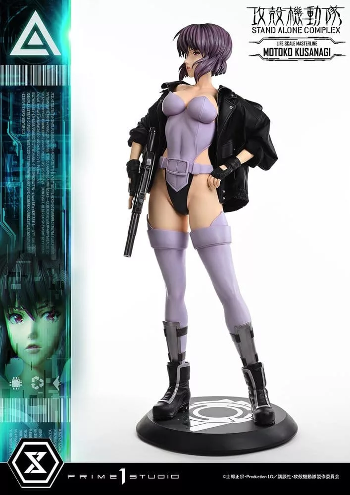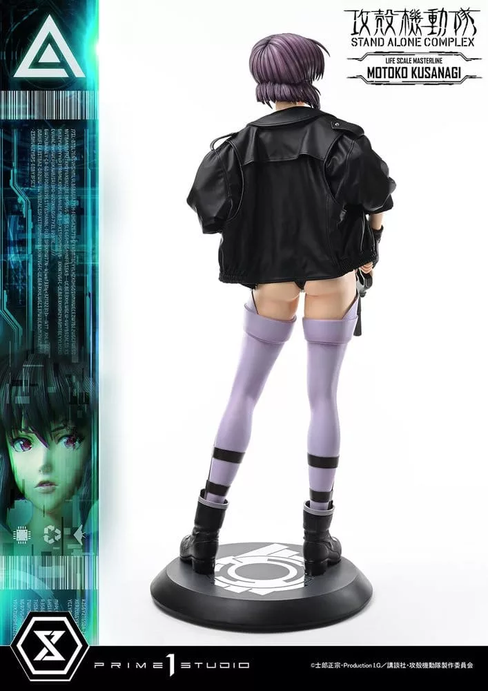 An expression filled with youth and passion. A resolute pose. The Major of the year 2030, realized as the world’s first life-size figure. First broadcast in 2002, 'Ghost in the Shell: Stand Alone Complex' is a landmark television anime series that introduced its cyberized near-future world to a wide audience and inspired ambitious sequels. From this influential series, Motoko Kusanagi now joins the Life Scale Masterline. Depicting the Major of the year 2030—youthful and driven with quiet intensity—the Motoko Kusanagi envisioned by director Kenji Kamiyama, and further shaped through the performances of Atsuko Tanaka and others, has been realized as the world’s first full-scale, life-size figure. Faithful to her official height of 168 cm, the figure’s realistic sculpting and paintwork convey a pose imbued with the pride of a leader, while fully capturing the subtle presence of the ghost she holds within. Crimson camera eyes, rendered with even the emerging lettering visible. The flow of her short hair falling diagonally forward. The head sculpt, marked by an intelligent expression, has been carefully refined with a subtle hint of the artificial nature of her cyborg body. The same approach is applied to her torso and limbs, forming a beautifully proportioned physique, while the finely crafted Sebro C-26A further emphasizes her overwhelming combat capability. In addition, her signature jacket is removable. Draped in high-quality fabric materials, it conveys a refined sheen and texture. Displayed without it, her lighter appearance evokes a more agile, active presence. Create your display just as you envision it. The specially designed base features the mark of Public Security Section 9. Its restrained silver tone evokes the atmosphere of a cyberized world. Created to commemorate the 30th anniversary of the anime’s production, this world’s first life-size figure of Motoko Kusanagi conveys the memories of the year 2030, and the past and future connected through it.