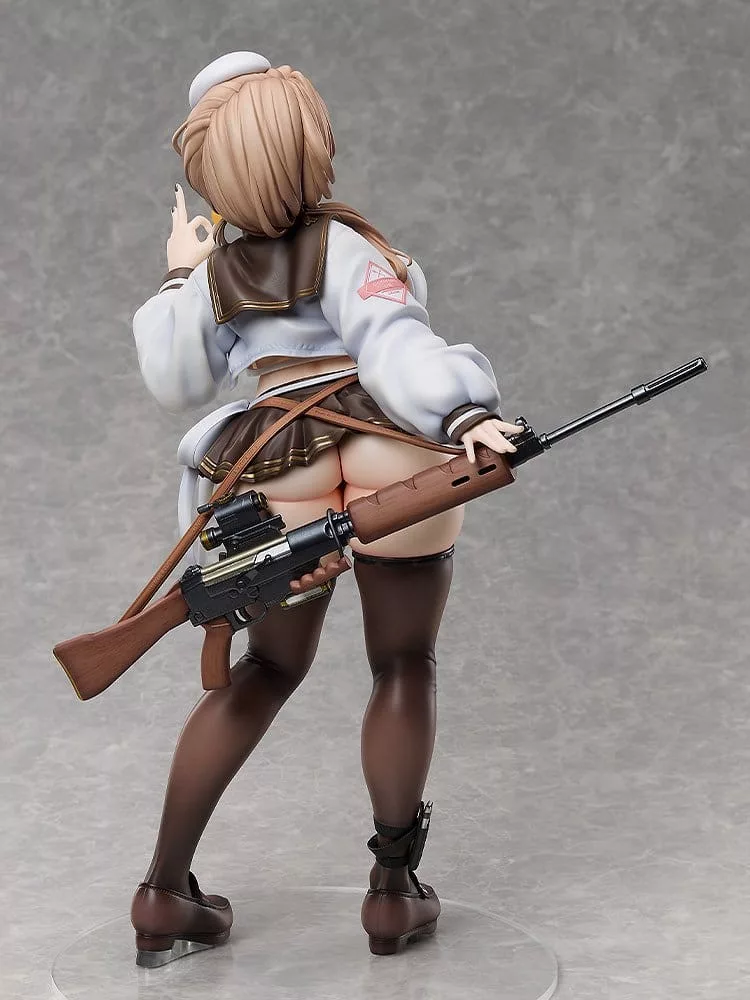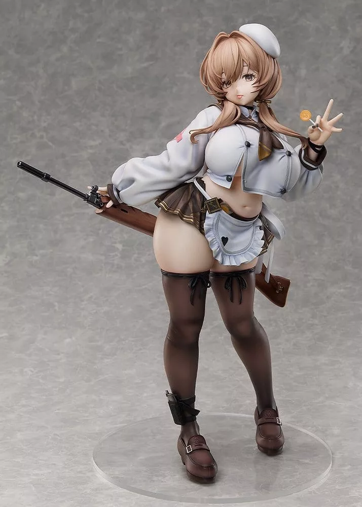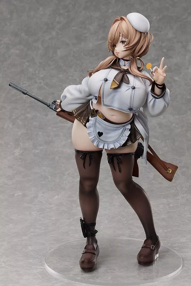 From 'GODDESS OF VICTORY: NIKKE' comes a 1/4 scale figure of the Tetra Line Cooking Oil Unit member, Bready! Her eye-catching proportions have been carefully sculpted based on her character design and official illustration. Gently tilting at the waist while playfully holding a lollipop, her teasing pose faithfully captures her charm in figure form. Special attention has also been paid to the visual appearance of textures, including the clothing hugging her curvy physique and the transparency of her stockings. Her rifle, the Chewing Taste, has also been meticulously crafted, transporting you further into the world of 'GODDESS OF VICTORY: NIKKE.' Be sure to add this impressively large and detailed figure of the charming Bready to your collection!