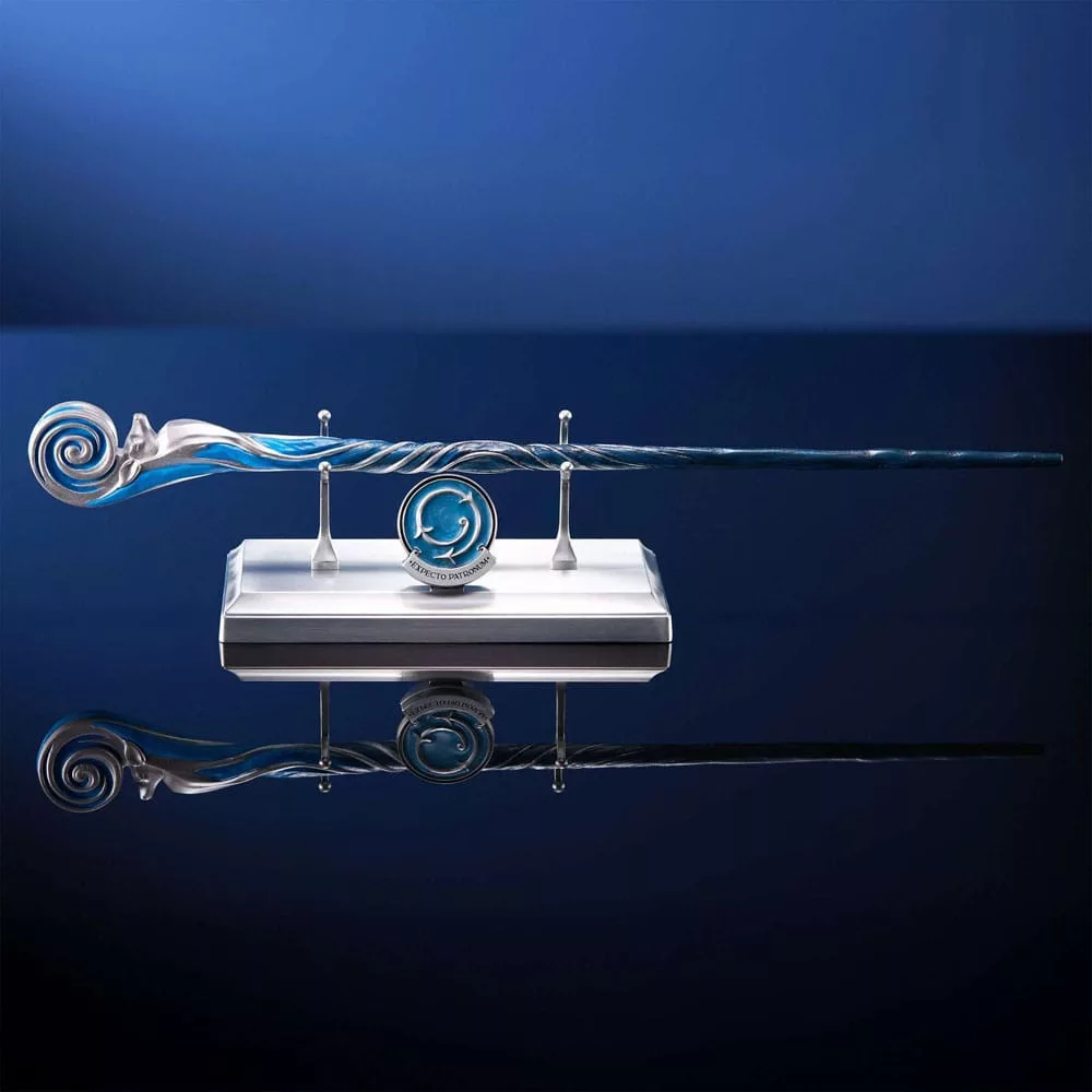 A limited edition Harry Potter&trade. collectible wand inspired by the Patronus Charm, complete with a silver display stand and a removable pin, which features the incantation and wand movement of the legendary spell.
