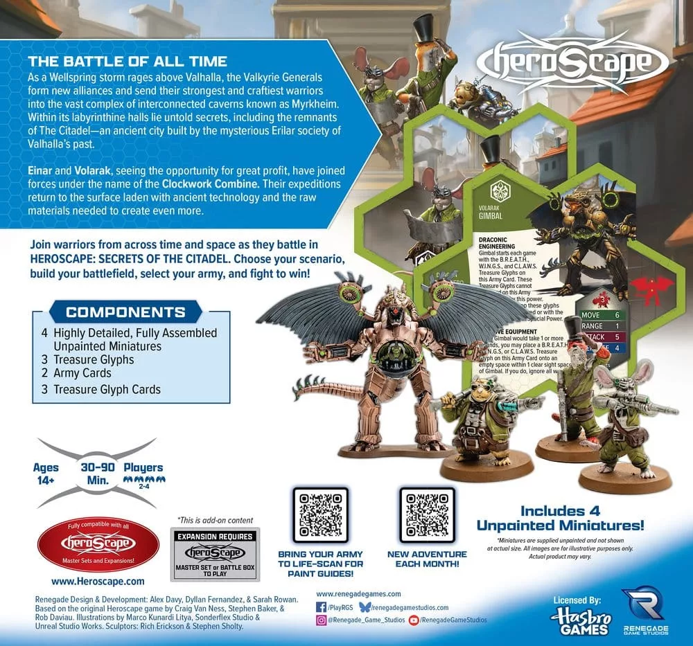 The Clockwork Combine Research Expedition brings cutting-edge experimental weaponry, modular technology, and precision scouts to the battlefields of Valhalla. This Army Expansion features Gimbal, a colossal inventor-dragon hybrid powered by detachable prototype systems, alongside the tactical Eisen Expedition—a three-figure scouting squad. Together with three powerful Treasure Glyphs, this pack delivers a toolbox of mobility, area control, and explosive offense that rewards clever activation order and battlefield awareness.