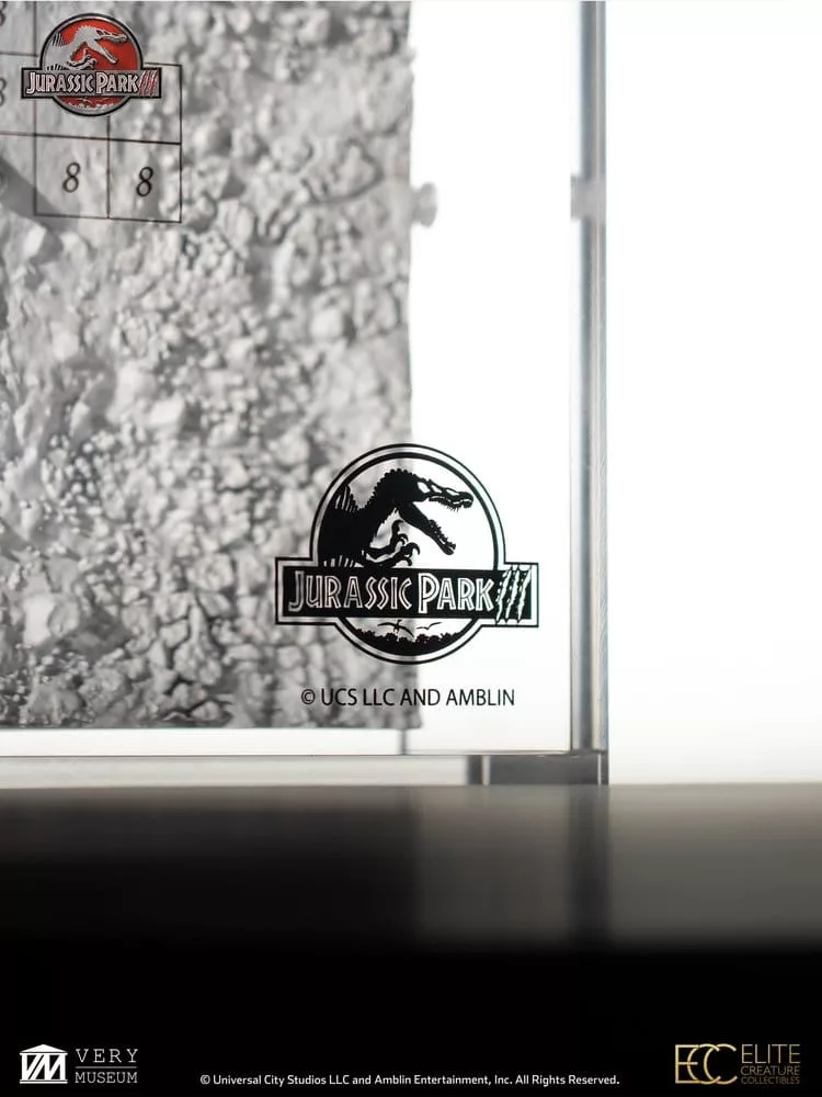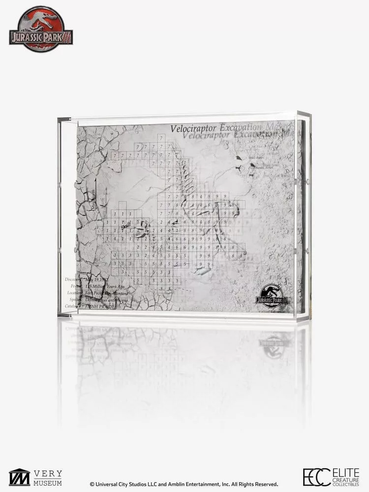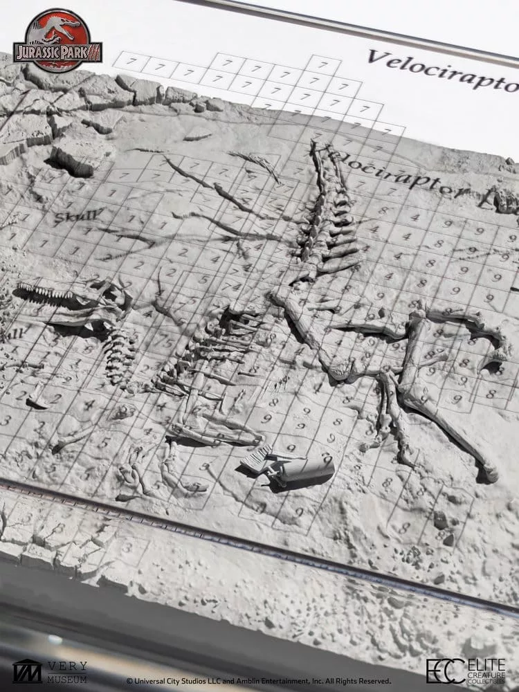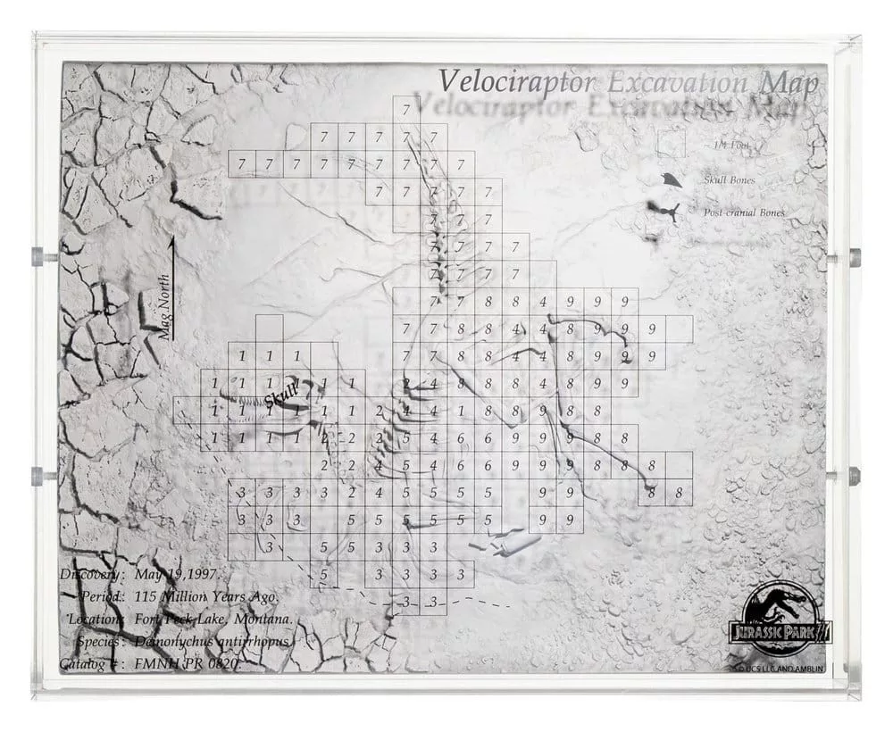 Elite Creature Collectibles is proud to present the Velociraptor Excavation Map, a three-dimensional art display that captures the raptor fossil embedded within rock, complete with excavation tools. Numbered markings on the map indicate the corresponding positions of each bone in the Velociraptor skeleton, offering both visual interest and educational value.