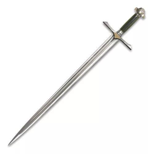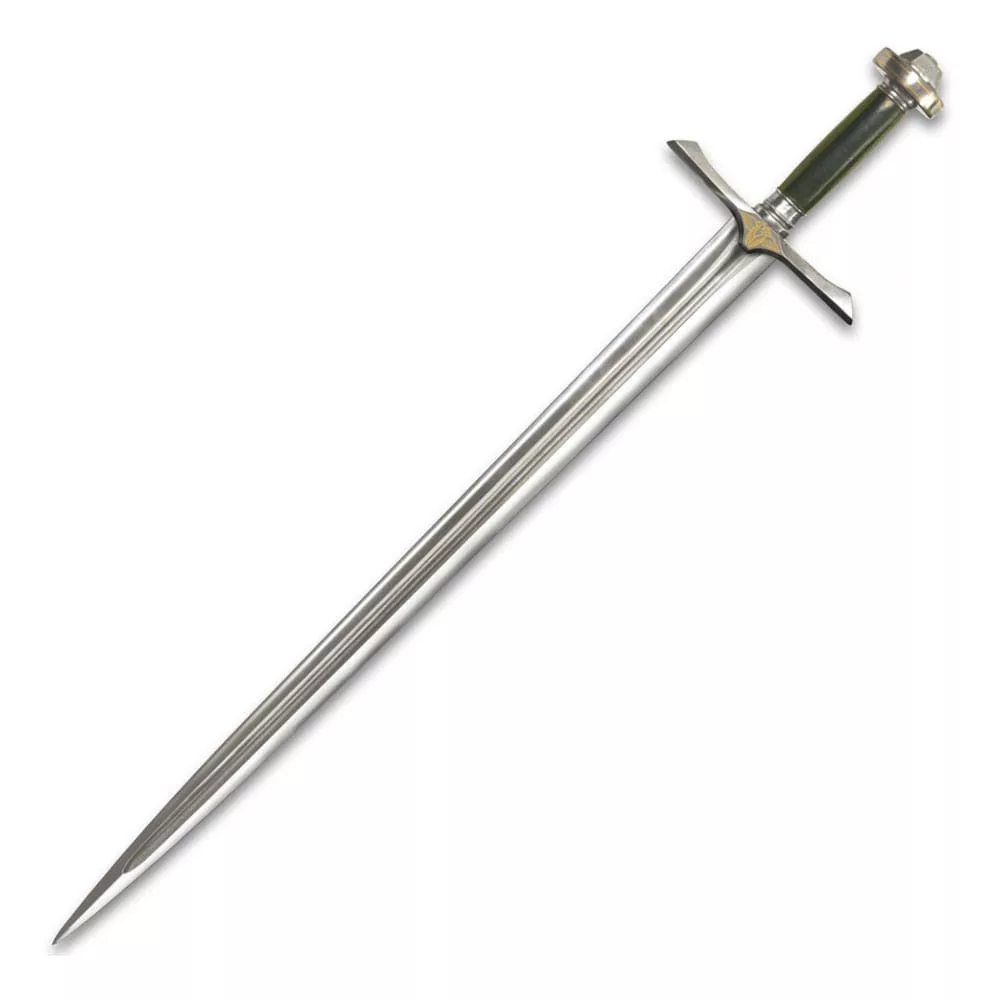 This authentically detailed sword replica is a reproduction of the actual filming prop sword crafted by Weta Workshop of New Zealand and used in THE LORD OF THE RINGS&trade. films presented by New Line Cinema. This meticulously detailed sword, with an overall length of 42', features a solid metal guard and pommel with an antique steel finish and a genuine leather wrapped grip. The cross guard is adorned with gold twin raven motifs and the pommel is accented with gold rings. The 33' false-edged blade is crafted of tempered stainless steel with a fuller groove. Each sword is presented with a wood wall display and certificate of authenticity.