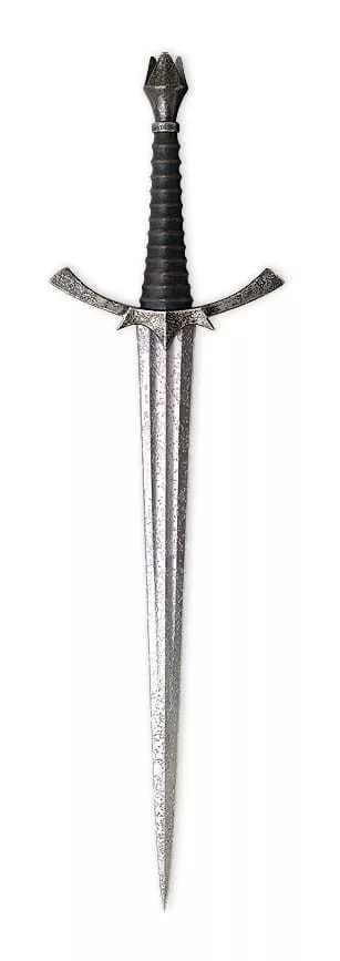 This authentically detailed dagger is a reproduction of the prop used by the Witch-King™, the leader of the Ringwraiths, as featured in New Line Cinema’s 'The Lord of the Rings™-The Fellowship of the Ring.' United® Cutlery, industry leader in fine movie reproductions, has meticulously recreated the actual prop under the direction of replica design supervisor Kit Rae. This officially licensed replica has been authentically 'aged' and 'battle worn' with a distressed, acid-etched finish to duplicate the original movie item as closely as possible. The 43 cm blade is crafted from 420J2 stainless steel, rather than the original prop’s carbon steel, in order to guarantee that the replica will last a lifetime with little maintenance. The cross guard and pommel are cast metal and the grip features an 'aged' genuine leather wrap. This item includes a 25 x 37 cm wood wall display plaque with a silkscreen design. Each replica is laser-serial-numbered on the blade.