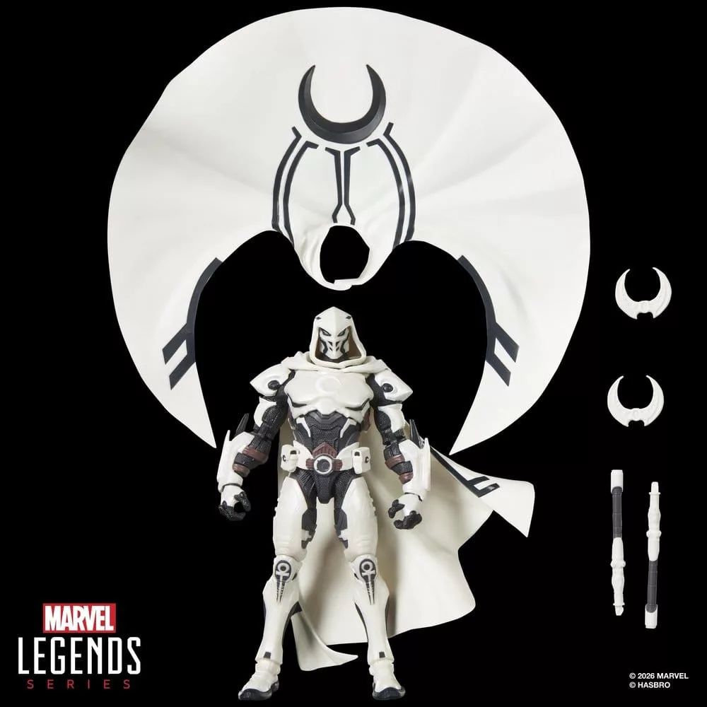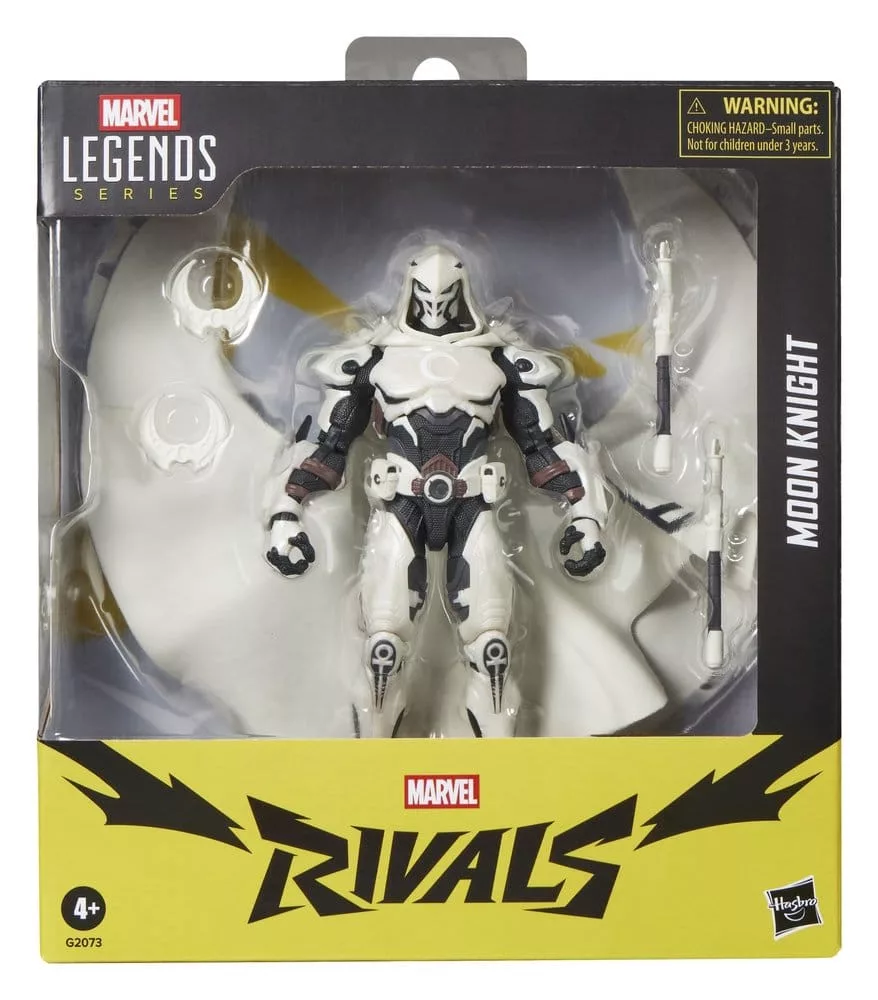 Bring the excitement and wonder of the Marvel Universe to your collection with Hasbro Marvel Legends Moon Knight action figure! This collectible 6-inch scale Marvel figure is inspired by the comic book character's appearance in the Marvel Rivals video game. Figures are fully articulated with premium design and poseable heads, arms, and legs. This Marvel Rivals action figure set comes with 5 accessories including 2 crescent darts, 2 billy clubs and an alternate moon-shaped cape. Hasbro Marvel action figures' 6 inch scale make them great for displaying in fans' collections. Reimagine game-inspired scenes on your shelf with Marvel Rivals collectibles.