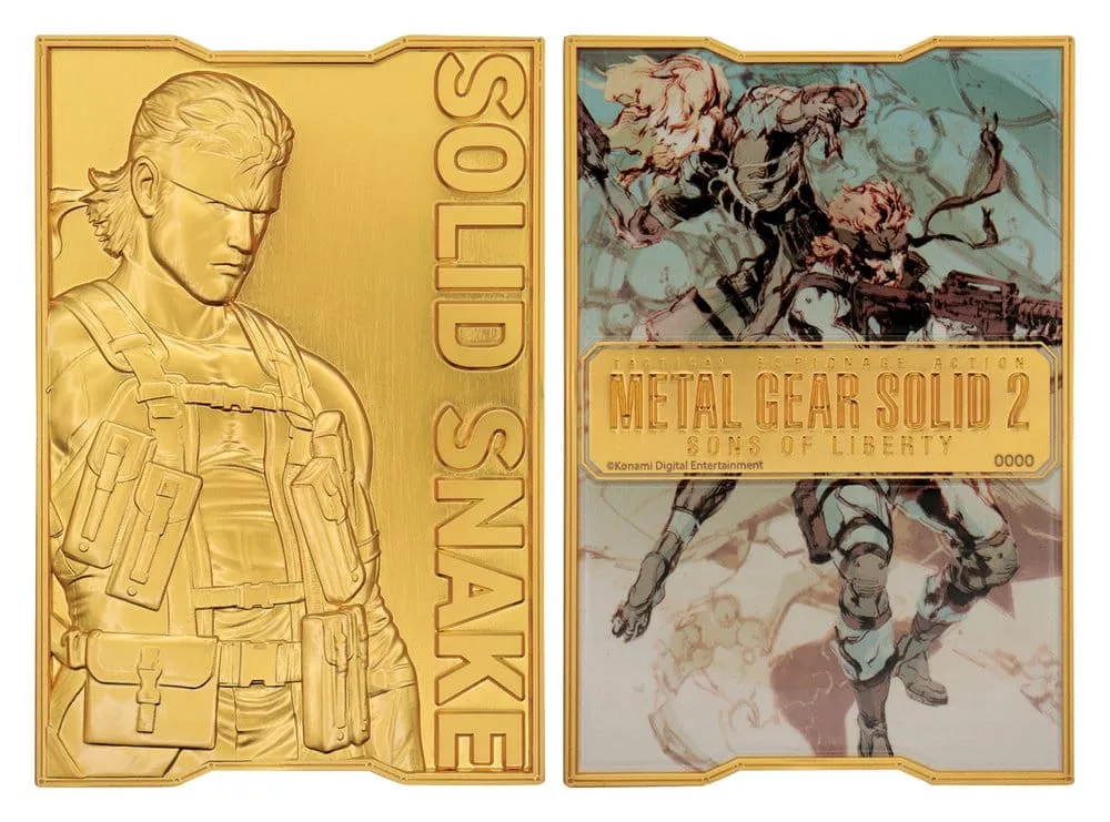 'The legendary soldier, the hero of the MGS series, Solid Snake takes a back seat in Metal Gear Solid 2 with rookie Raiden leading the way, but he's there along the way to help out. This limited edition printed 24k gold plated ingot comes with a display stand in its presentation box and is individually numbered as one of 2,001 (the year of release of the game).