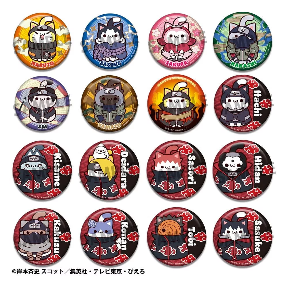 This is an assortment of 16 metal badges from the 'Naruto Shippuden Mega Cat Project Nyaruto!' collection by Megahouse. Each badge is approximately 6 cm in size.