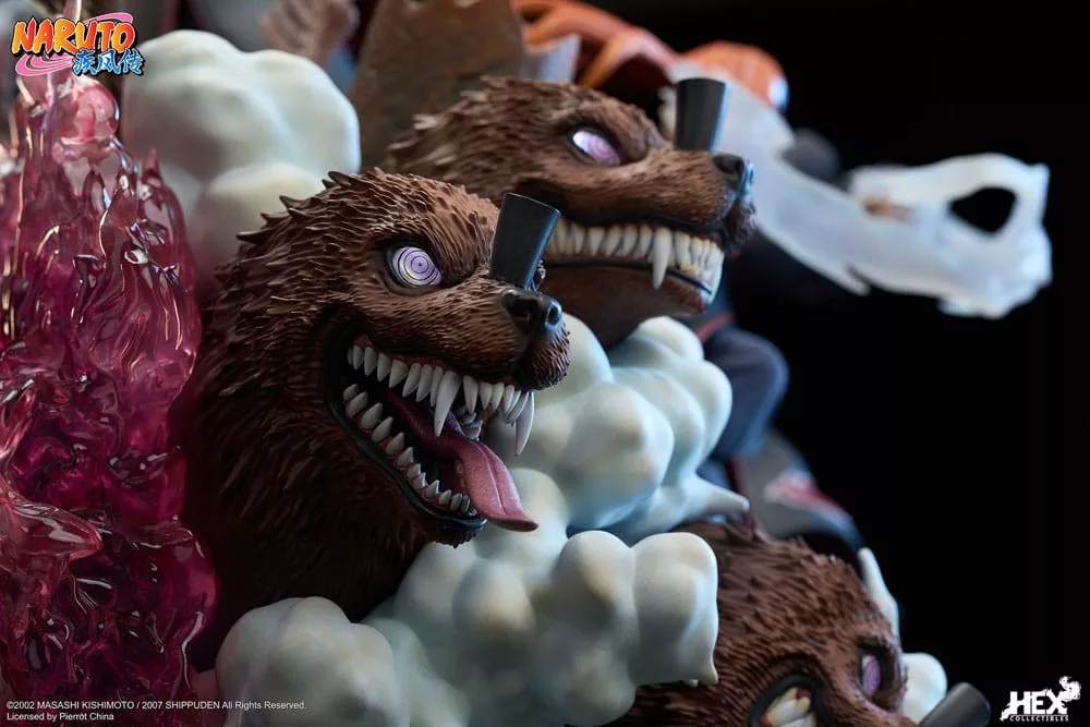 Beneath their feet lies a breathtaking depiction of the unique architecture of the Village Hidden in the Rain. The metallic sheen on pipes and bricks lends a lifelike quality, enhancing the overall realism. Giant multi-head dog and snake-tailed chameleon are summoned around them, while at the backside, the King of Hell opens its large mouth in anticipation of souls. Wreathing the entire diorama, flames and smoke merge with the enveloping darkness, giving an extremely impressive feeling to the whole statue.