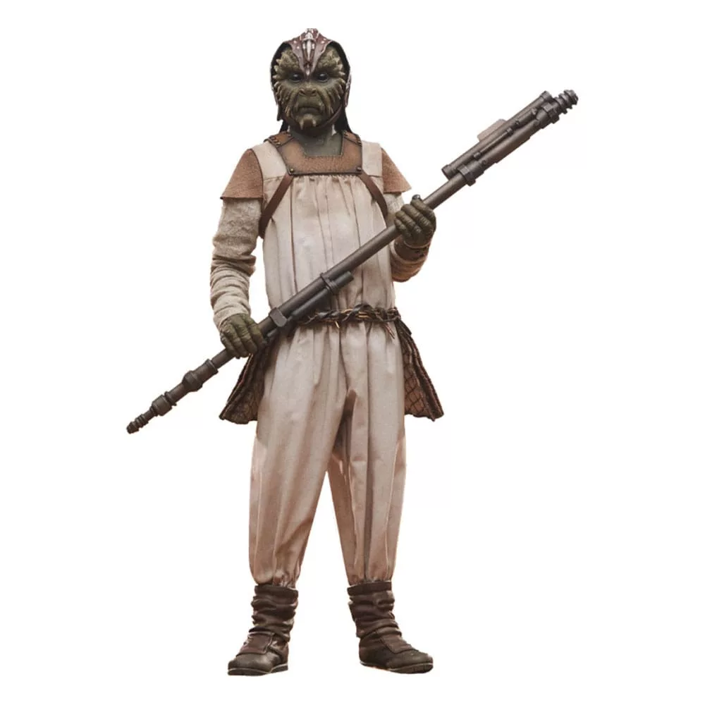 Inspired by the character's appearance in Return of the Jedi&trade., this fully articulated, highly poseable high-end Star Wars figure wears tailored fabric clothing accurate to his on-screen ensemble. His outfit consists of a tan vest, trousers, and hood, as well as armor befitting a henchman in Jabba the Hutt's entourage. The Klaatu&trade. Sixth Scale High-End Collectible Figure also wears a belt laden with thermal detonators across his chest and includes a pair of relaxed hands and a pair of gripping hands for the vibrostaff accessory.