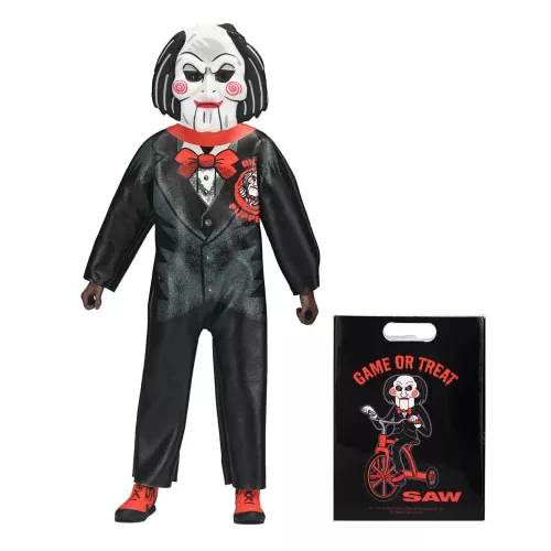 Dressed as Billy the Puppet from Saw, this frightful figure wears a mask and soft goods clothing replicating the vinyl look of classic costumes and comes complete with a trick-or-treat bag accessory inspired by the movie.