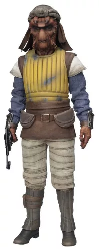 Vizam is a red Nikto, or Kajain’sa’Nikto, a humanoid species from the planet Kitan. His scaly skin, horns, and facial spikes lend him an intimidating appearance. Found in Jabba the Hutt’s employ, Vizam works as a gunner on the sail barge alongside fellow criminals. He demonstrates his confidence and fighting capabilities against Jedi Knight Luke Skywalker on Tatooine.