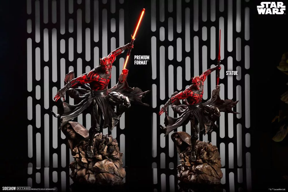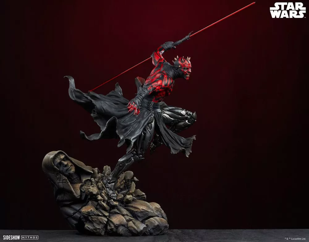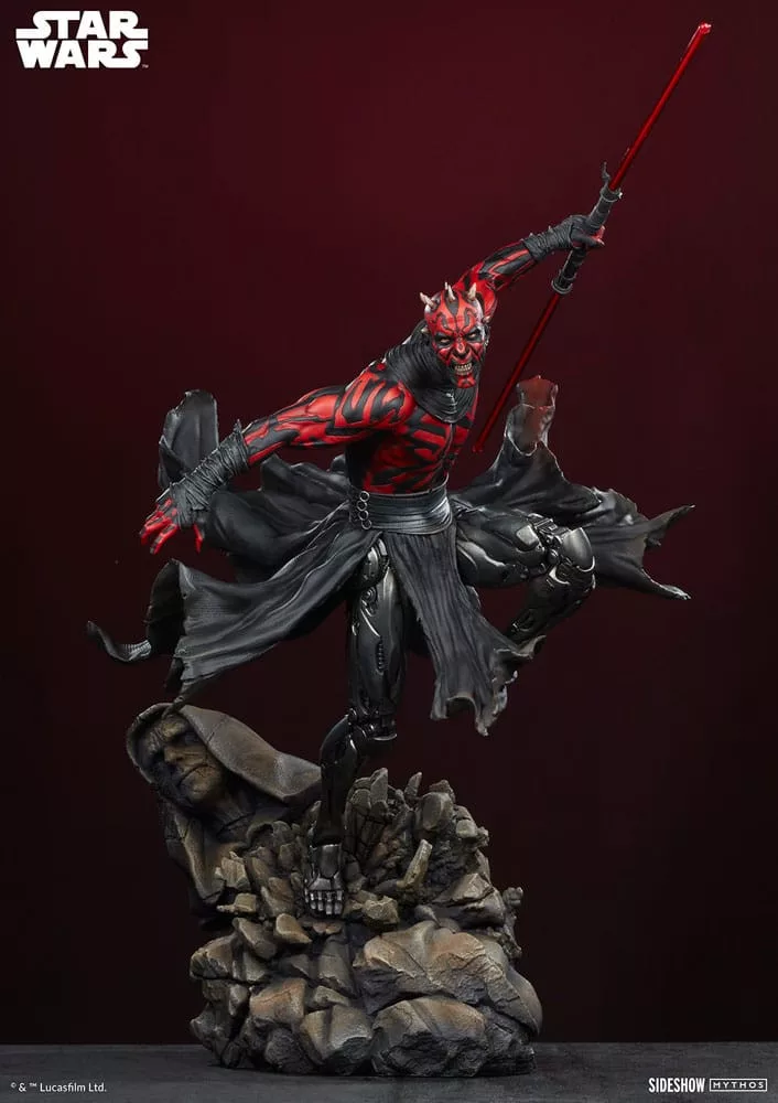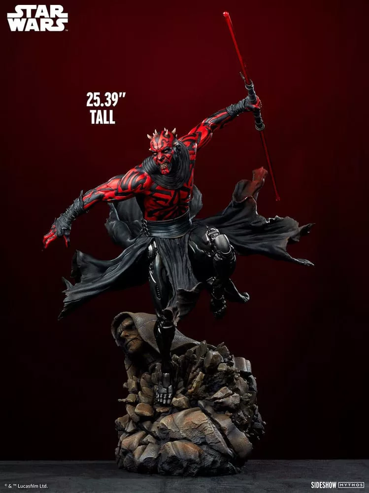 The Darth Maul&trade. Mythos Premium Format&trade. Figure measures 25.39 inches (64.5 cm) tall, 16.54 inches (42 cm) wide, and 27.55 inches (70 cm) deep as this hateful Zabrak warrior leaps from the crumbling remains of a Sith temple. Ready to cut down his enemies, Darth Maul wields his famed dual-bladed red lightsaber. His savage rage and loathing for the accursed Jedi help him carve a path through the galaxy toward their utter ruin.