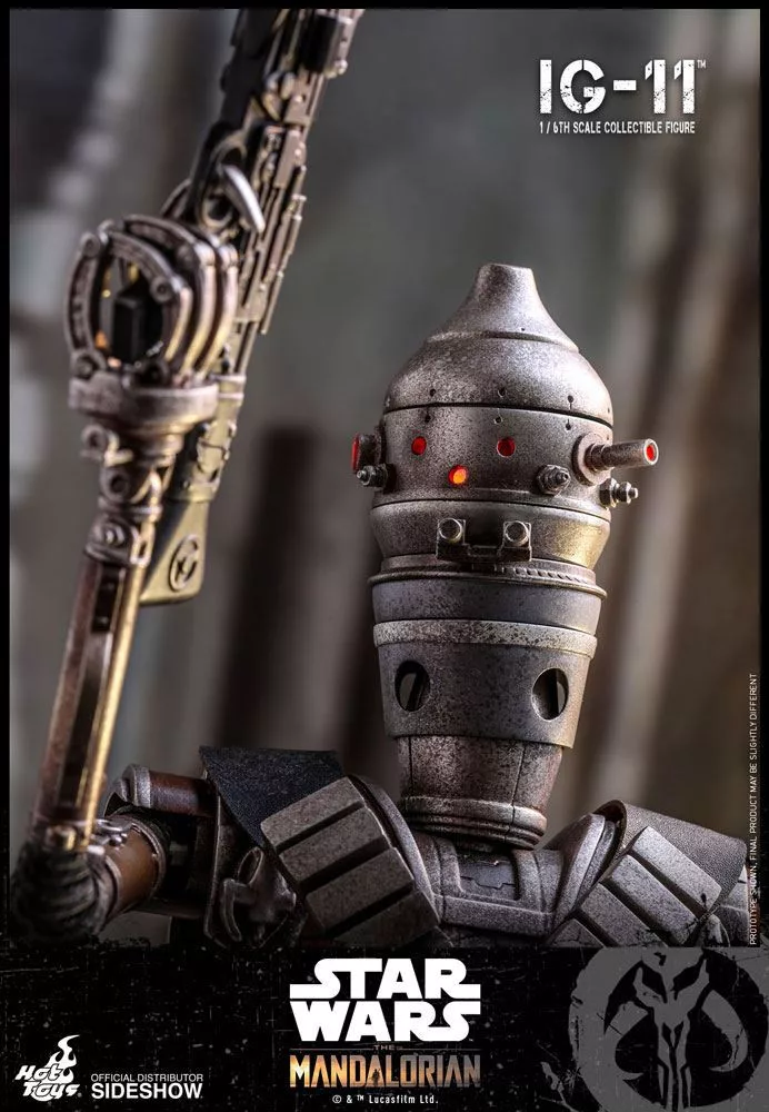 The highly-accurate IG-11 Sixth Scale Collectible Figure features a highly detailed mechanical body with great articulations, skillfully applied weathering effects, two blasters, and a desert-themed figure base. Beautifully crafted mechanical head with LED light-up function included.