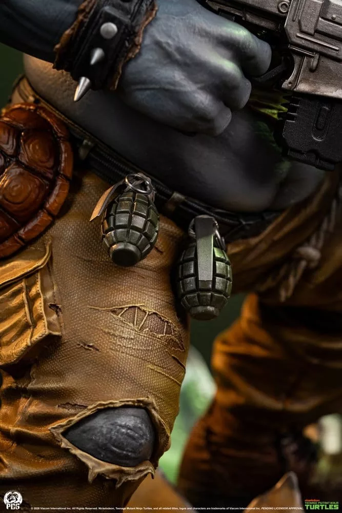 This highly detailed statue features beautiful sculpting throughout, from the leather like texture of Rocksteady's skin to the mechanical details of his blaster and other armaments. This mutant menace is outfitted with a ton of beautifully realized accessories including grenades, a turtle shell knee pad, a massive knife strapped to his back and a bandolier packed with heavy artillery. The Rocksteady 1:3 Statue also includes a swap out portrait without his military-style cap and goggles offering collectors multiple display options.