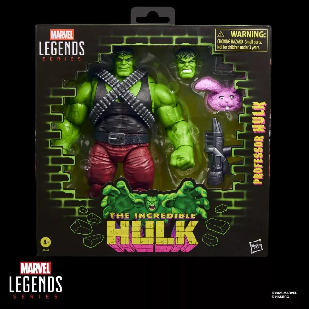 Bring the excitement and wonder of the Marvel Universe to your collection with Hasbro Marvel Legends Professor Hulk figure! This collectible 15 cm scale Marvel action figure is detailed to look like the character from Marvel's Incredible Hulk comics. Professor Hulk action figure is fully articulated with premium design and poseable head, arms, and legs. This action figure set comes with 7 accessories: alternate angry head, 2 alt Hulk hands, blaster, glasses, and pink bunny slippers showcasing Hulk in his new super-strong, intelligent form. Hasbro Marvel action figures' 15 cm scale make them great for posing and displaying in fans' collections. Pose Professor Hulk and reimagine Hulk comics-inspired scenes on your shelf with Marvel Legends action figures and Marvel collectibles.