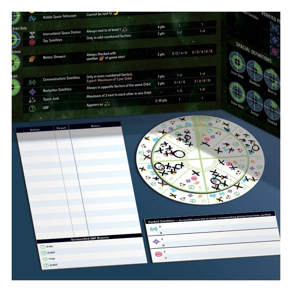 - Players use innovative magnetic, rotating Space Boards to track their sightings.
