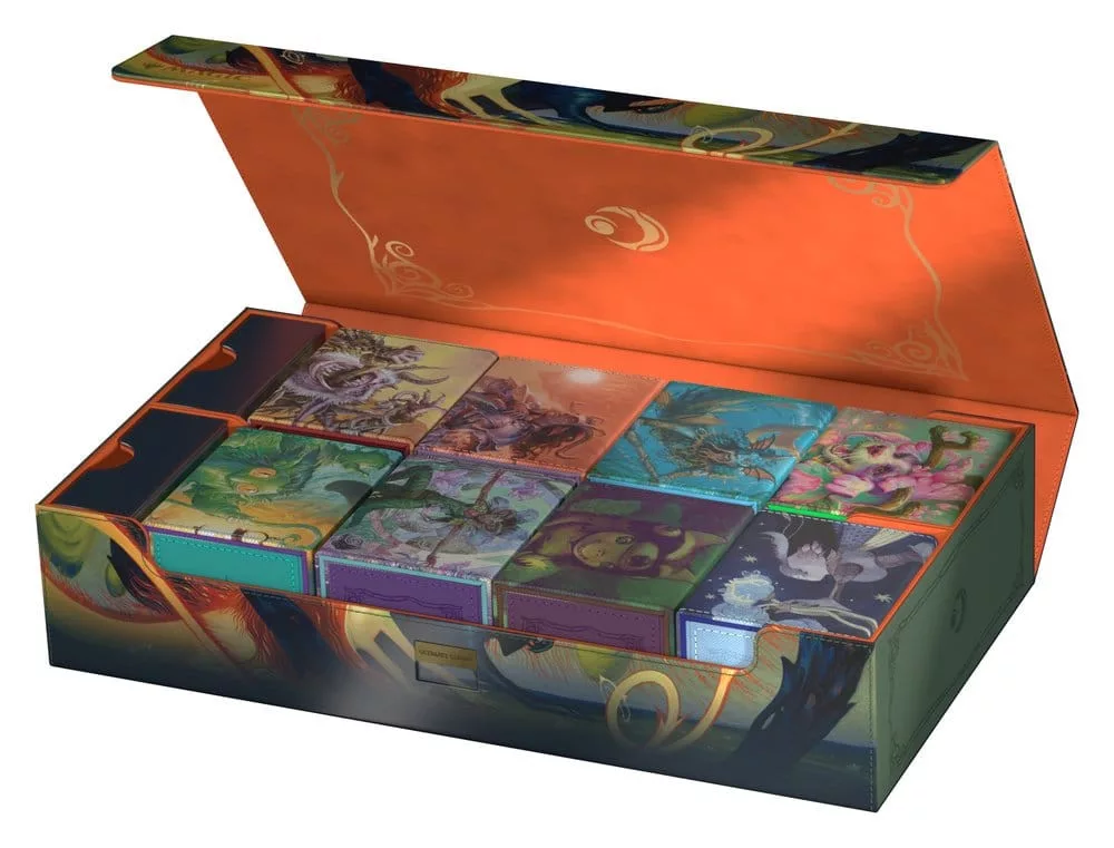 Ultimate Guard's Omnihive 1000+ Xenoskin with officially licensed artwork from Magic: The Gathering's 'Lorwyn Eclipsed' set is the ultimate MTG mass storage box for decks, cards, and accessories. Designed to hold multiple MTG deck boxes and/or play-mats simultaneously, it features two flexibly positionable and stackable magnetic dice trays over two compartments, durable Xenoskin material, high-quality microfiber inner lining, a strong magnetic closure and Ultimate Guard's trusted ZnapClaw mechanism. With capacity for eight Sidewinder 100+ or six Sidewinder 133+ deck boxes, the Omnihive 1000+ Xenoskin also holds up to 1000 double-sleeved cards in Ultimate Guard sleeves*, making it the perfect storage box for a cube.