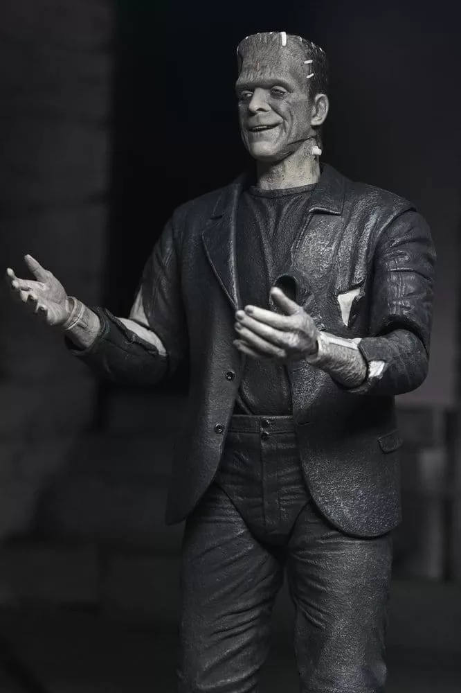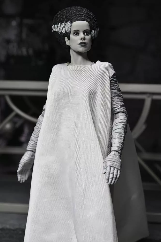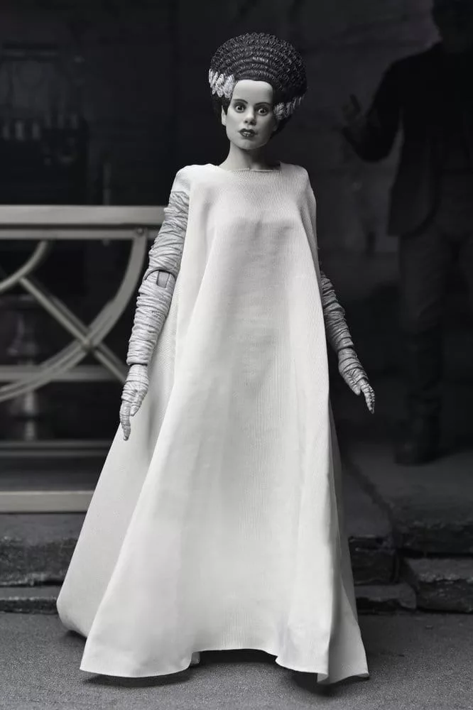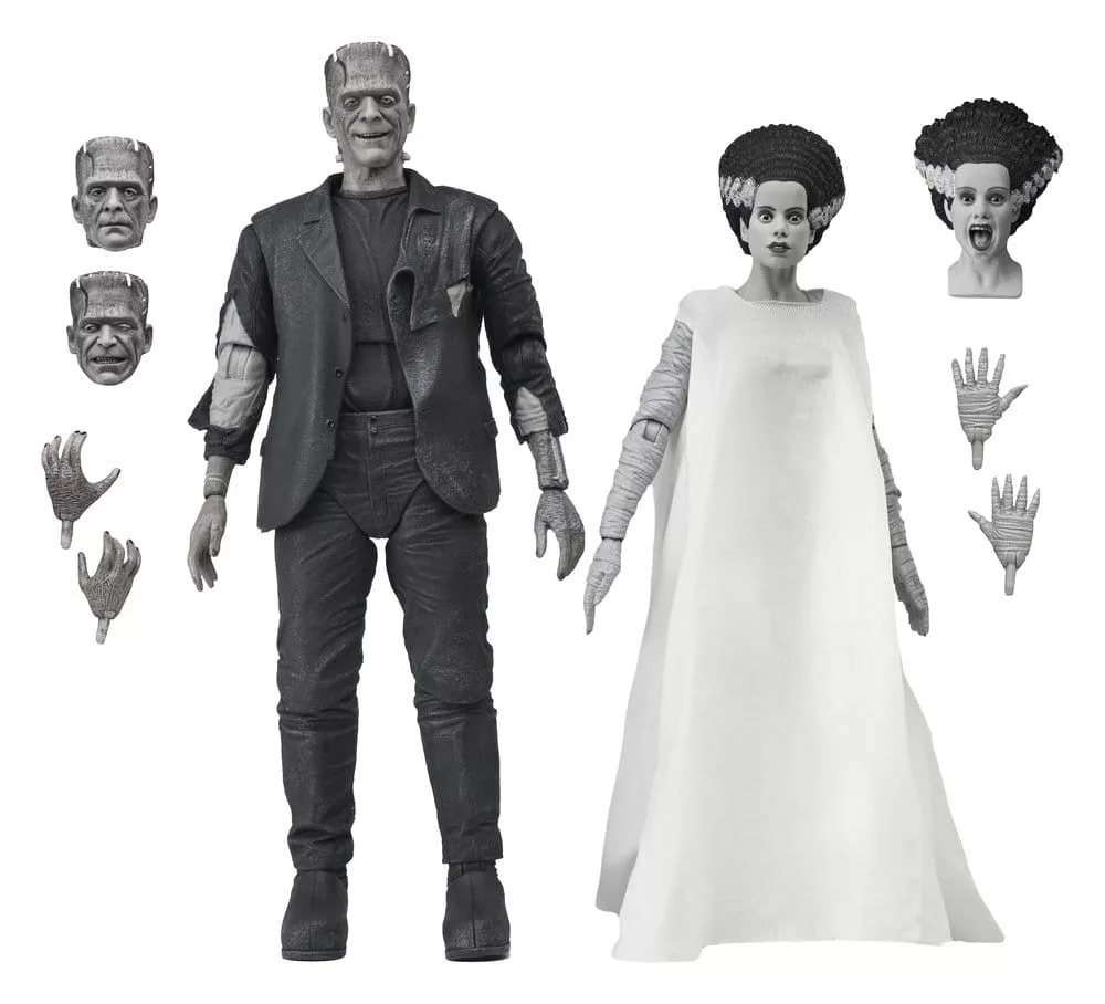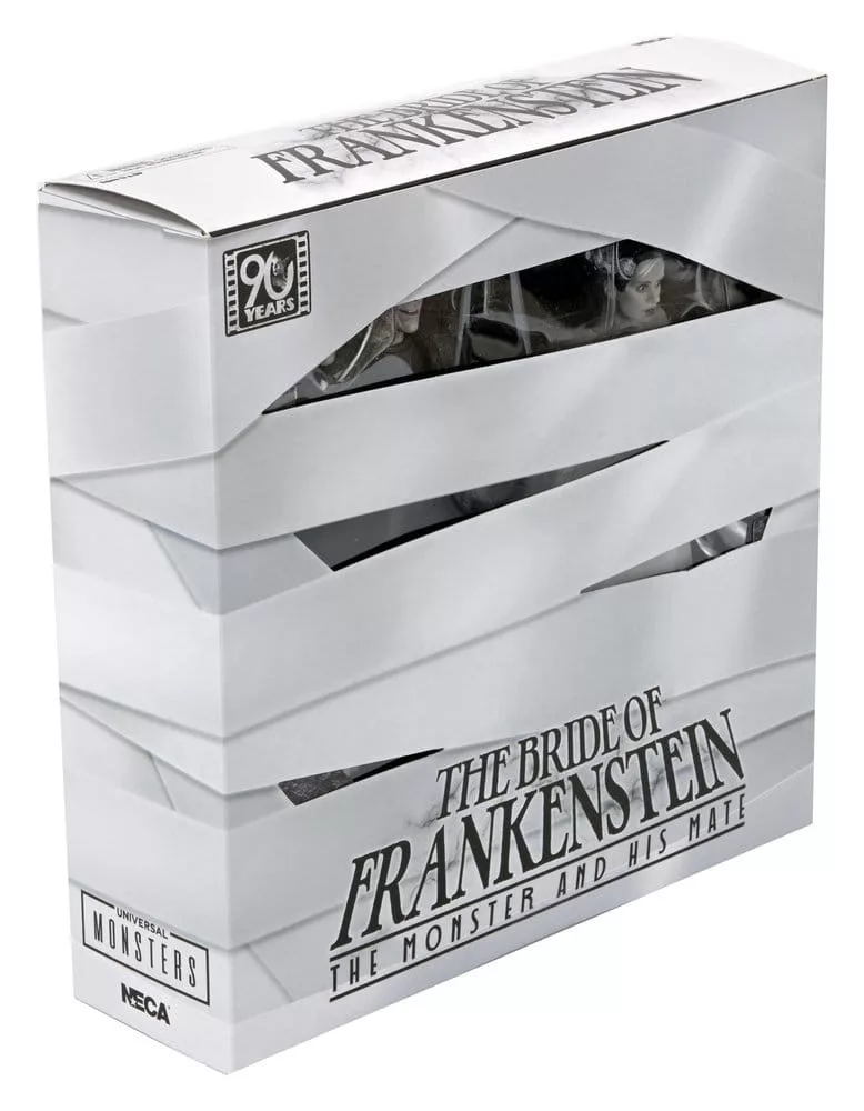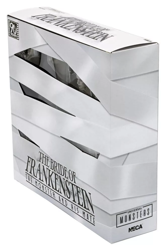 'We belong dead...' Celebrate over 90 years of horror and doomed romance with this haunting tribute to the classic Universal Monsters film, The Bride of Frankenstein! NECA proudly presents a commemorative action figure 2-pack that brings Frankenstein’s Monster and his Bride together in one electrifying collector’s set. When the Monster meets his true love and finds that his feelings are unrequited, he flips the switch that implodes the castle—ending their tragic love story before it even begins. Featuring black and white deco, looking as if they just stepped off the silver screen, these 7-inch scale figures include multiple interchangeable heads and hands, and a soft goods robe for the Bride. Bring home this infamous couple, together at last in limited-edition window box packaging with slipcover. Size: 17.8 cm (7.00')
