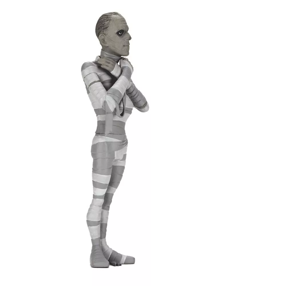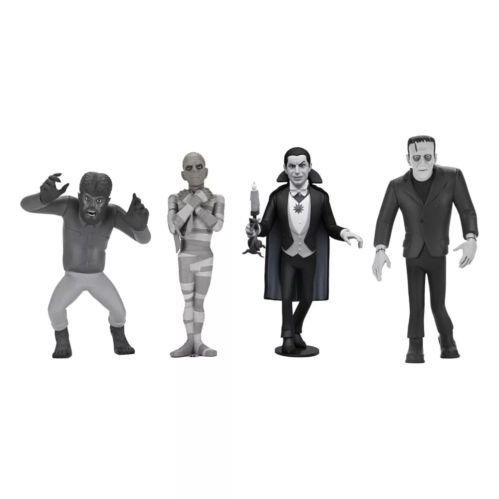 Fans of the world-famous monsters of classic horror movies will love this action figure assortment featuring the Wolf Man, The Mummy, Dracula, and Frankenstein's Monster. Standing approximately 6 inches tall, each figure features a grayscale deco and comes in special black-and-white packaging with cutout backdrop and silver foil logo. Figures sold separately.