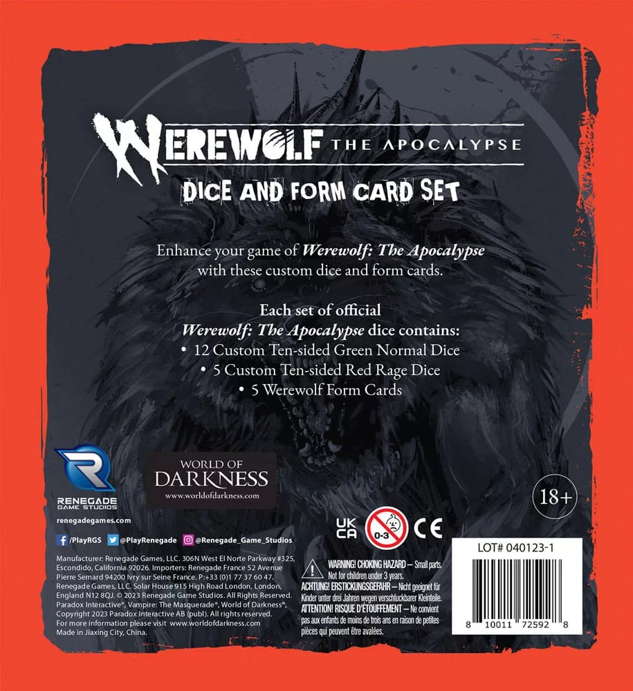 Enhance your game of Werewolf: The Apocalypse with these custom dice and cards designed for clarity and style. Each set of official Werewolf: The Apocalypse 5th Edition dice contains a set of dice for one player and five form cards to track which of the five forms their character is in and remember the rules for that form.