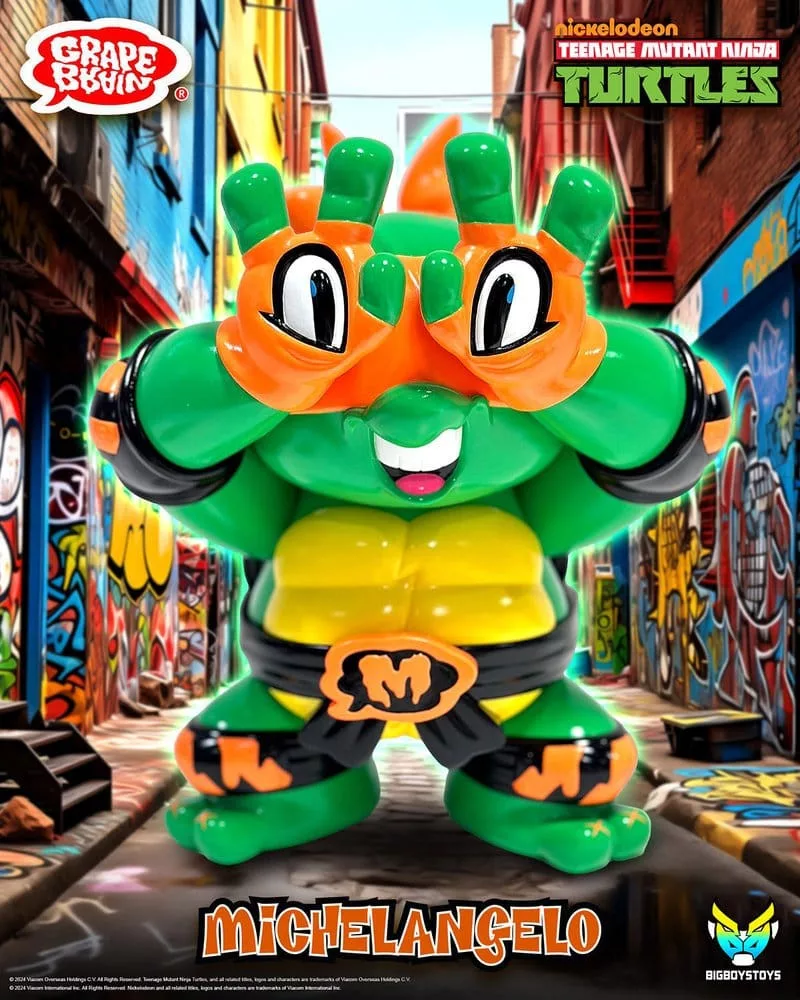 The Michelangelo TMNT x Grape Brain Vinyl Figure features 6 points of articulation and is approx. 24,0 cm tall. Made with vinyl and PVC this collectible is pre-painted with no assembly required. .