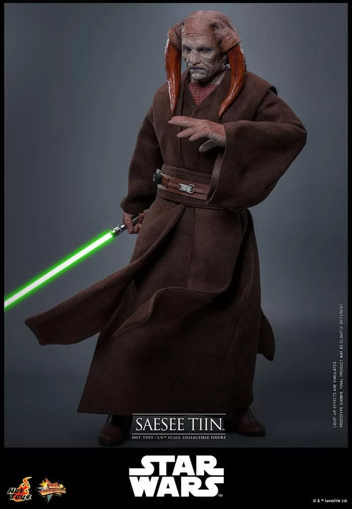 Hot Toys is proud to unveil the 1/6th scale Saesee Tiin Collectible Figure, a tribute to this noble Jedi Master. Crafted with a brand-new head sculpt featuring a rolling eyeball mechanism and screen-accurate facial patterns, the figure captures Tiin's distinctive appearance and textured skin. Equipped with five interchangeable hands and three gloved hands, including hands for holding the lightsaber and using the Force, this figure offers versatile display options. Tiin's costume is faithfully tailored, featuring a wired belt-embedded outer robe layered over an undershirt, pants, long boots, and a wired Jedi robe to recreate his Jedi Master look. Weapons and accessories include a green LED-lighted lightsaber with switchable blades and forearm armor. Notably, the forearm armor pieces are inspired by Tiin's appearance in the Clone Wars animated series.
