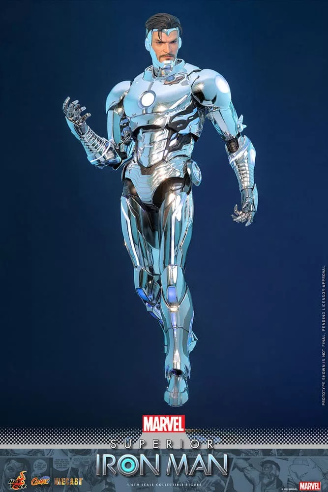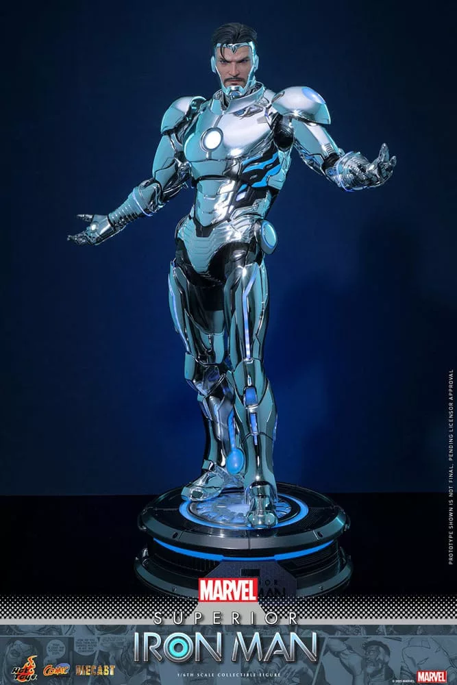 Sideshow and Hot Toys are thrilled to announce the Superior Iron Man Sixth Scale Collectible Figure. Crafted with premium die-cast materials, the armor is coated in gleaming metallic silver with an electroplating finish. The removable chest armor reveals intricate internal mechanics, offering a visual glimpse into the mechanized wonders beneath. This figure features full-body LED lighting powered via a single USB-C port, casting an imposing blue glow when fully activated. Luminous points include arms, palms, legs, abdomen, circle-shaped Arc Reactor on chest, and more. The set includes six interchangeable hands to recreate combat and heroic poses. Completing the display is a specially designed metallic silver figure stand with LED light-up base, casting a reflective glow across the armor.