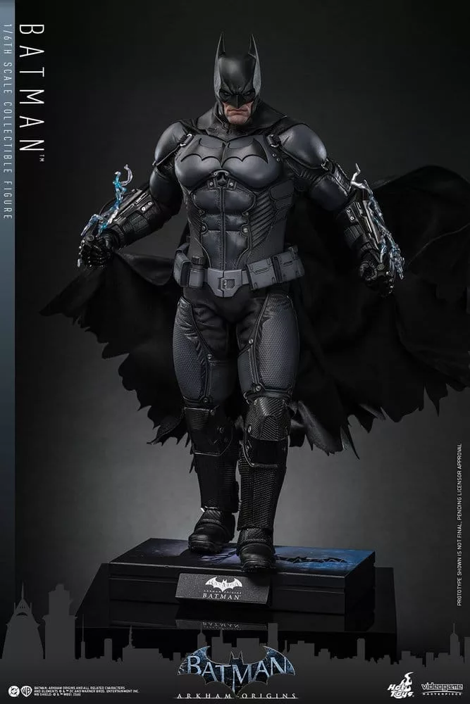 Sideshow and Hot Toys are proud to present the highly anticipated Batman&trade. Sixth Scale Collectible Figure from the video game Batman: Arkham Origins. This sixth scale figure features a newly developed masked head with two interchangeable lower face sculpts that showcase both his brooding look and determined, clenched-teeth expression. The Batman action figure's costume is faithfully recreated according to the game's bulky and armored yet practical design, featuring a newly developed Batsuit with gray and black full-body armor layered over an undersuit on the muscular body. A pair of Heavy Gauntlets, boots, a utility belt, and a wire-embedded cape complete his outfit. The figure also includes a pair of Shock Gloves armor plates that feature translucent blue lightning effects to showcase their electrified impact. Coming with seven interchangeable hands, including fists, open gesture hands, and weapon-holding hands, collectors are able to display him with dynamic poses.