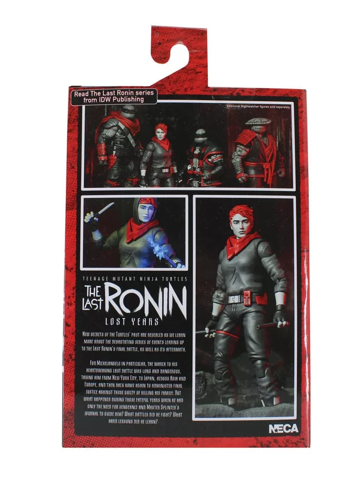 From the Teenage Mutant Ninja Turtles comic book series, The Last Ronin - The Lost Years! The tale of the Last Ronin's first mission continues as new secrets from the Turtles' past are revealed. After Raphael has fallen, the remaining Turtles regroup and form the Nightwatchers along with April and Casey. As seen in issue #3, this April O'Neil action figure stands in 7-inch scale and features a stylized paint job for a comic-authentic look. Accessories include shock batons and energy effects, rebar, and vegetable knife. April is the last of the NECA Nightwatcher figures needed to complete the team (sold separately). Comes in collector-friendly packaging with original illustrations by The Last Ronin artist Ben Bishop.