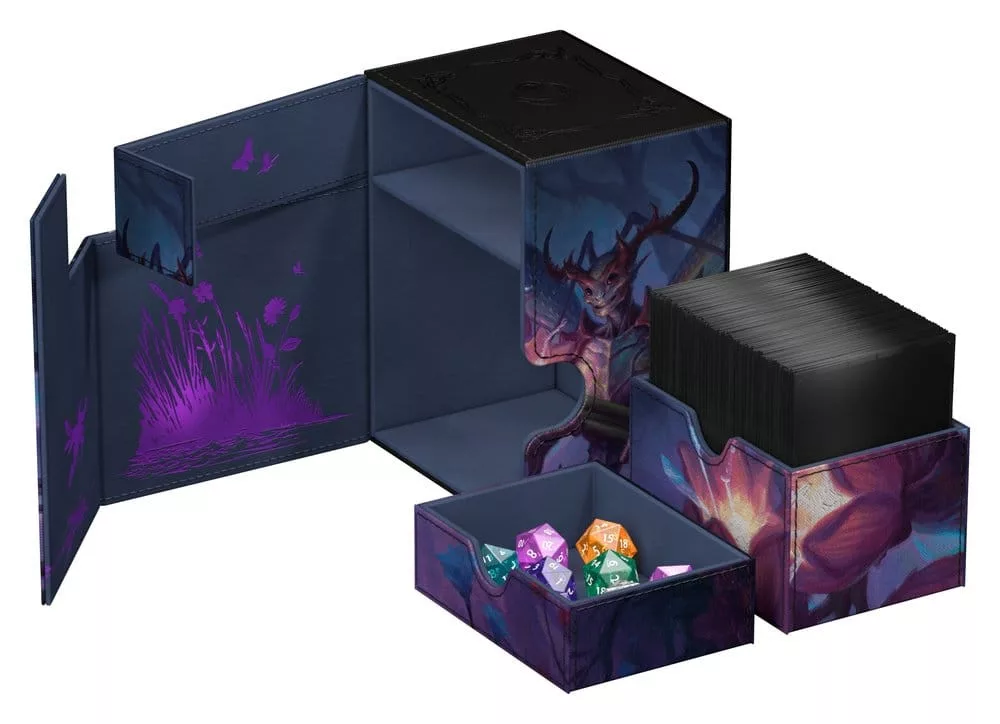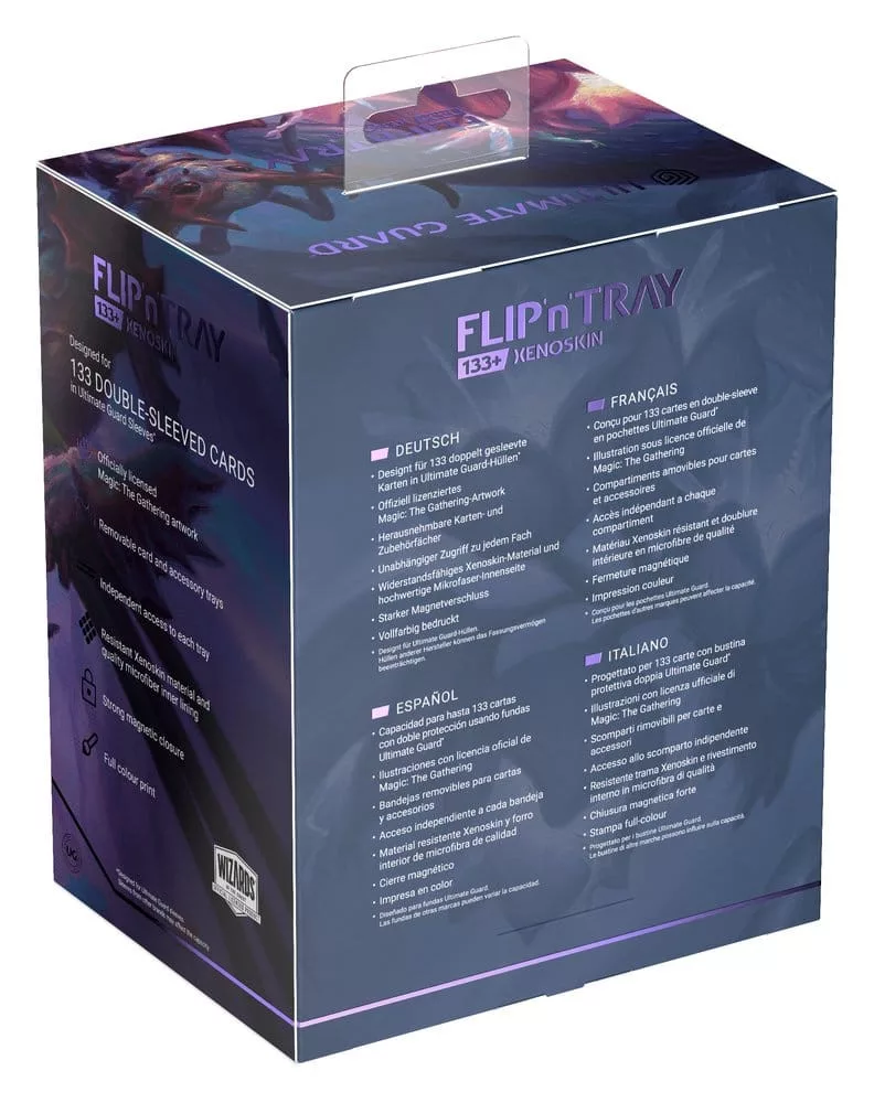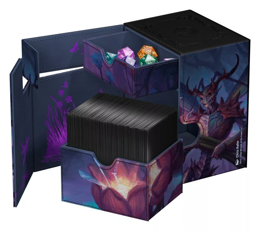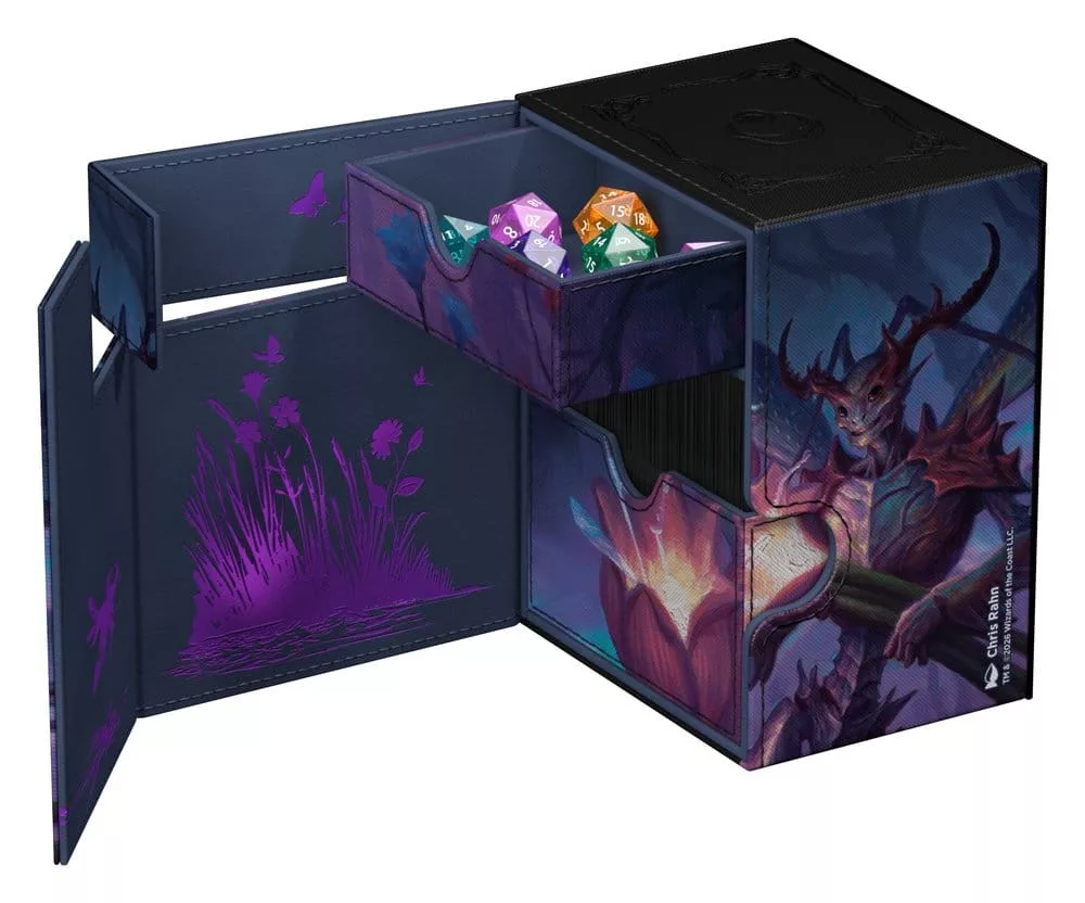 Ultimate Guard's Flip'n'Tray 133+ Xenoskin is a premium MTG deck box for all Magic formats (Commander/EDH, Modern, Standard, etc.) featuring two independently accessible trays — one for 133 double-sleeved cards in Ultimate Guard sleeves* and one for dice and accessories. Printed with officially licensed artwork from Magic: The Gathering's 'Lorwyn Eclipsed' set, the Flip'n'Tray features durable Xenoskin material, a microfiber inner lining, and strong magnetic closures that guarantee exceptional card protection. Designed to combine with other Ultimate Guard products, this deck box can hold a Boulder 100+ when the card tray is removed.